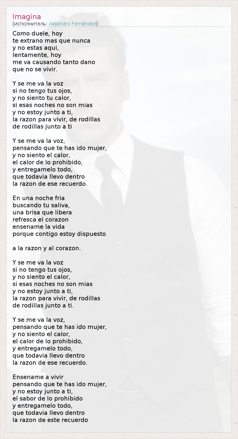 Это интересно:Алехандро сын знаменитого Висенте Фернандеса. Он с честью поддерживал семейные традиции и своим появлением на сцене прославил мексиканских ранчерасов среди молодого поколения. Бархатный голос певца и глубина его звучания, заставляли поклонников падать в обморок.Он родился в Мехико 24 апреля 1971 года, но как это ни странно был зарегистрирован в Гвадалахаре, в Ялиско - оно известно... продолжение