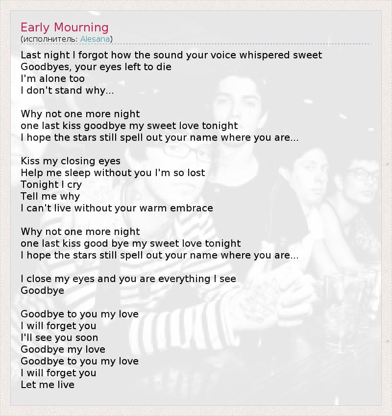Last night I forgot how the sound your voice whispered sweet Goodbyes, your eyes left to die I'm alone too I don't stand why... Why not one more night one last kiss goodbye my sweet love tonight I hope the stars still spell out your name where you are... Kiss my closing eyes Help me sleep without you I'm so lost Tonight I cry Tell me why I can't live without your warm embrace Why not one more night one last kiss good bye my sweet love tonight I hope the stars still spell out your name where you are... I close my eyes and you are everything I see Goodbye Goodbye to you my love I will forget you I'll see you soon Goodbye my love Goodbye to you my love I will forget you Let me live