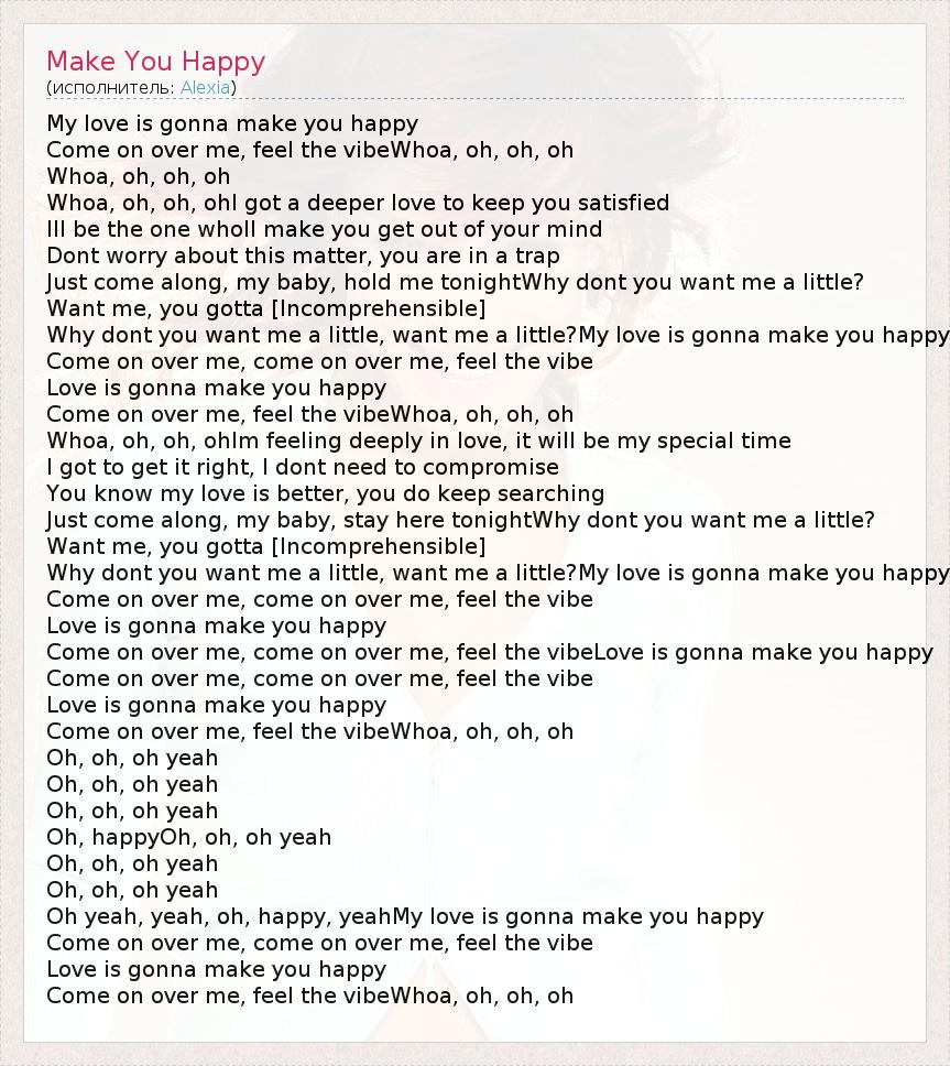 My love is gonna make you happy Come on over me, feel the vibeWhoa, oh, oh, oh Whoa, oh, oh, oh Whoa, oh, oh, ohI got a deeper love to keep you satisfied Ill be the one wholl make you get out of your mind Dont worry about this matter, you are in a trap Just come along, my baby, hold me tonightWhy dont you want me a little? Want me, you gotta [Incomprehensible] Why dont you want me a little, want me a little?My love is gonna make you happy Come on over me, come on over me, feel the vibe Love is gonna make you happy Come on over me, feel the vibeWhoa, oh, oh, oh Whoa, oh, oh, ohIm feeling deeply in love, it will be my special time I got to get it right, I dont need to compromise You know my love is better, you do keep searching Just come along, my baby, stay here tonightWhy dont you want me a little? Want me, you gotta [Incomprehensible] Why dont you want me a little, want me a little?My love is gonna make you happy Come on over me, come on over me, feel the vibe Love is gonna make you happy Come on over me, come on over me, feel the vibeLove is gonna make you happy Come on over me, come on over me, feel the vibe Love is gonna make you happy Come on over me, feel the vibeWhoa, oh, oh, oh Oh, oh, oh yeah Oh, oh, oh yeah Oh, oh, oh yeah Oh, happyOh, oh, oh yeah Oh, oh, oh yeah Oh, oh, oh yeah Oh yeah, yeah, oh, happy, yeahMy love is gonna make you happy Come on over me, come on over me, feel the vibe Love is gonna make you happy Come on over me, feel the vibeWhoa, oh, oh, oh