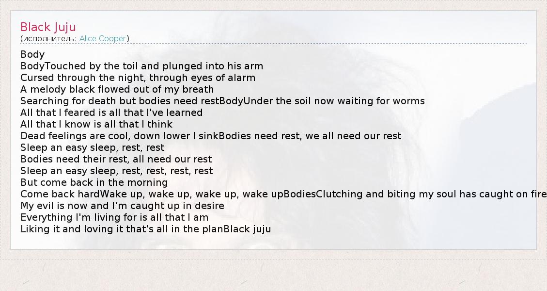 Body BodyTouched by the toil and plunged into his arm Cursed through the night, through eyes of alarm A melody black flowed out of my breath Searching for death but bodies need restBodyUnder the soil now waiting for worms All that I feared is all that I've learned All that I know is all that I think Dead feelings are cool, down lower I sinkBodies need rest, we all need our rest Sleep an easy sleep, rest, rest Bodies need their rest, all need our rest Sleep an easy sleep, rest, rest, rest, rest But come back in the morning Come back hardWake up, wake up, wake up, wake upBodiesClutching and biting my soul has caught on fire My evil is now and I'm caught up in desire Everything I'm living for is all that I am Liking it and loving it that's all in the planBlack juju