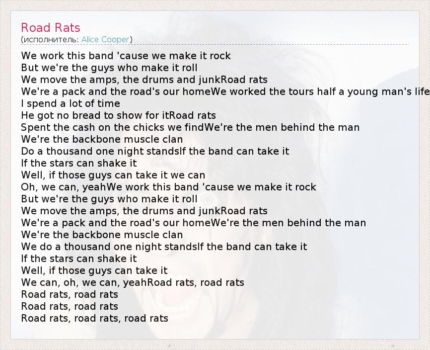 We work this band 'cause we make it rock But we're the guys who make it roll We move the amps, the drums and junkRoad rats We're a pack and the road's our homeWe worked the tours half a young man's life I spend a lot of time He got no bread to show for itRoad rats Spent the cash on the chicks we findWe're the men behind the man We're the backbone muscle clan Do a thousand one night standsIf the band can take it If the stars can shake it Well, if those guys can take it we can Oh, we can, yeahWe work this band 'cause we make it rock But we're the guys who make it roll We move the amps, the drums and junkRoad rats We're a pack and the road's our homeWe're the men behind the man We're the backbone muscle clan We do a thousand one night standsIf the band can take it If the stars can shake it Well, if those guys can take it We can, oh, we can, yeahRoad rats, road rats Road rats, road rats Road rats, road rats Road rats, road rats, road rats