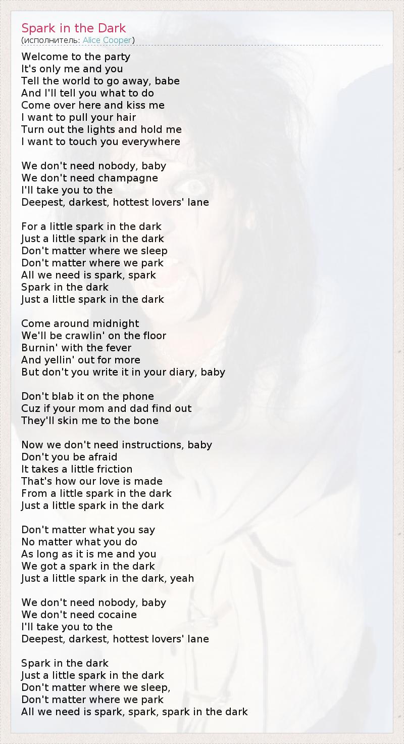 Добро пожаловать на вечеринку Только для нас двоих, Забудь обо всем на свете, 1 крошка, А я скажу тебе, что делать. Иди сюда и поцелуй меня, Хочу притянуть тебя за волосы, Погаси свет и обними меня, Я хочу почувствовать всю тебя. 2 Нам никто не нужен, крошка, Нам не нужно шампанское, Вместе со мной ты пройдёшь по Самой сокровенной, таинственной, жаркой тропе - тропе влюблённых. Маленькая искра в темноте, Просто маленькая искра в темноте. Неважно, где мы спим, Не имеет значения, где мы припарковались, Всё, что нам нужно – искра, искра, Искра в темноте, Просто маленькая в темноте... Приходи около полуночи, Мы будем ползать по полу, Сгорая от возбуждения, И кричать, прося большего. Только не описывай это в своем дневнике, детка. Не разболтай это по телефону, Потому что если твои мамочка и папочка узнают, Они сдерут с меня шкуру. Обойдемся без инструкций, крошка, Ты ведь не боишься? Понадобится немного трения Для того, чтобы наша любовь возникла Из маленькой искры в темноте, Просто маленькой искры в темноте... Неважно, что ты скажешь, Неважно, что ты сделаешь, Пока есть я и ты, Между нами будет искра в темноте, Просто маленькая искра в темноте... Нам никто не нужен, крошка, Нам не нужен кокаин. Вместе со мной ты пройдёшь по Самой сокровенной, таинственной, жаркой тропе - тропе влюблённых. Искра в темноте, Просто маленькая искра в темноте, Неважно, где мы спим, Не имеет значения, где мы припарковались, Все, что нам нужно – искра, искра, искра в темноте... 1 - дословно: скажи миру уйти прочь 2 - дословно: "Хочу потрогать тебя везде"