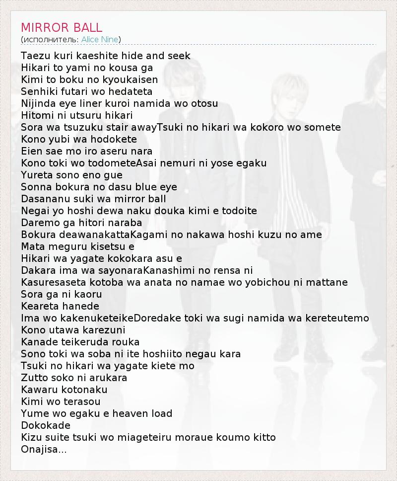 Taezu kuri kaeshite hide and seek Hikari to yami no kousa ga Kimi to boku no kyoukaisen Senhiki futari wo hedateta Nijinda eye liner kuroi namida wo otosu Hitomi ni utsuru hikari Sora wa tsuzuku stair awayTsuki no hikari wa kokoro wo somete Kono yubi wa hodokete Eien sae mo iro aseru nara Kono toki wo todometeAsai nemuri ni yose egaku Yureta sono eno gue Sonna bokura no dasu blue eye Dasananu suki wa mirror ball Negai yo hoshi dewa naku douka kimi e todoite Daremo ga hitori naraba Bokura deawanakattaKagami no nakawa hoshi kuzu no ame Mata meguru kisetsu e Hikari wa yagate kokokara asu e Dakara ima wa sayonaraKanashimi no rensa ni Kasuresaseta kotoba wa anata no namae wo yobichou ni mattane Sora ga ni kaoru Keareta hanede Ima wo kakenuketeikeDoredake toki wa sugi namida wa kereteutemo Kono utawa karezuni Kanade teikeruda rouka Sono toki wa soba ni ite hoshiito negau kara Tsuki no hikari wa yagate kiete mo Zutto soko ni arukara Kawaru kotonaku Kimi wo terasou Yume wo egaku e heaven load Dokokade Kizu suite tsuki wo miageteiru moraue koumo kitto Onajisa...