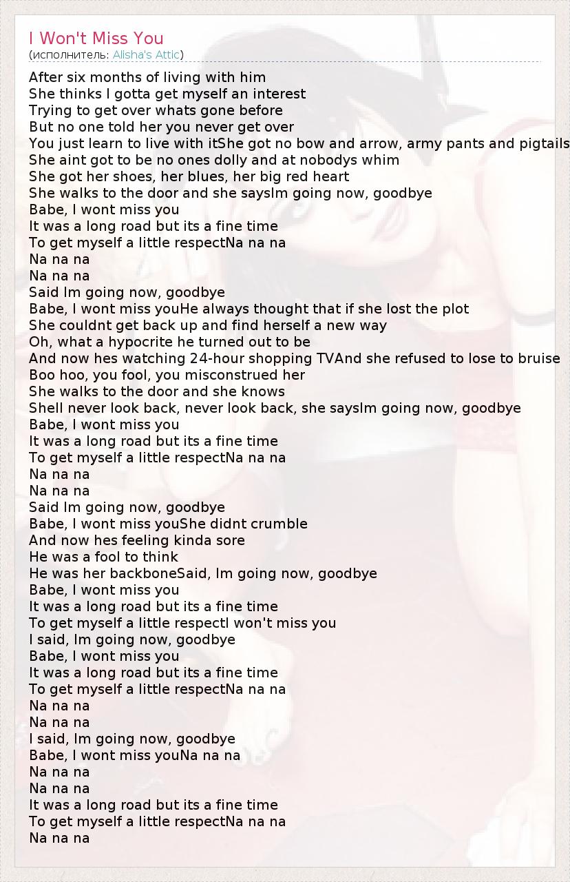 After six months of living with him She thinks I gotta get myself an interest Trying to get over whats gone before But no one told her you never get over You just learn to live with itShe got no bow and arrow, army pants and pigtails She aint got to be no ones dolly and at nobodys whim She got her shoes, her blues, her big red heart She walks to the door and she saysIm going now, goodbye Babe, I wont miss you It was a long road but its a fine time To get myself a little respectNa na na Na na na Na na na Said Im going now, goodbye Babe, I wont miss youHe always thought that if she lost the plot She couldnt get back up and find herself a new way Oh, what a hypocrite he turned out to be And now hes watching 24-hour shopping TVAnd she refused to lose to bruise Boo hoo, you fool, you misconstrued her She walks to the door and she knows Shell never look back, never look back, she saysIm going now, goodbye Babe, I wont miss you It was a long road but its a fine time To get myself a little respectNa na na Na na na Na na na Said Im going now, goodbye Babe, I wont miss youShe didnt crumble And now hes feeling kinda sore He was a fool to think He was her backboneSaid, Im going now, goodbye Babe, I wont miss you It was a long road but its a fine time To get myself a little respectI won't miss you I said, Im going now, goodbye Babe, I wont miss you It was a long road but its a fine time To get myself a little respectNa na na Na na na Na na na I said, Im going now, goodbye Babe, I wont miss youNa na na Na na na Na na na It was a long road but its a fine time To get myself a little respectNa na na Na na na