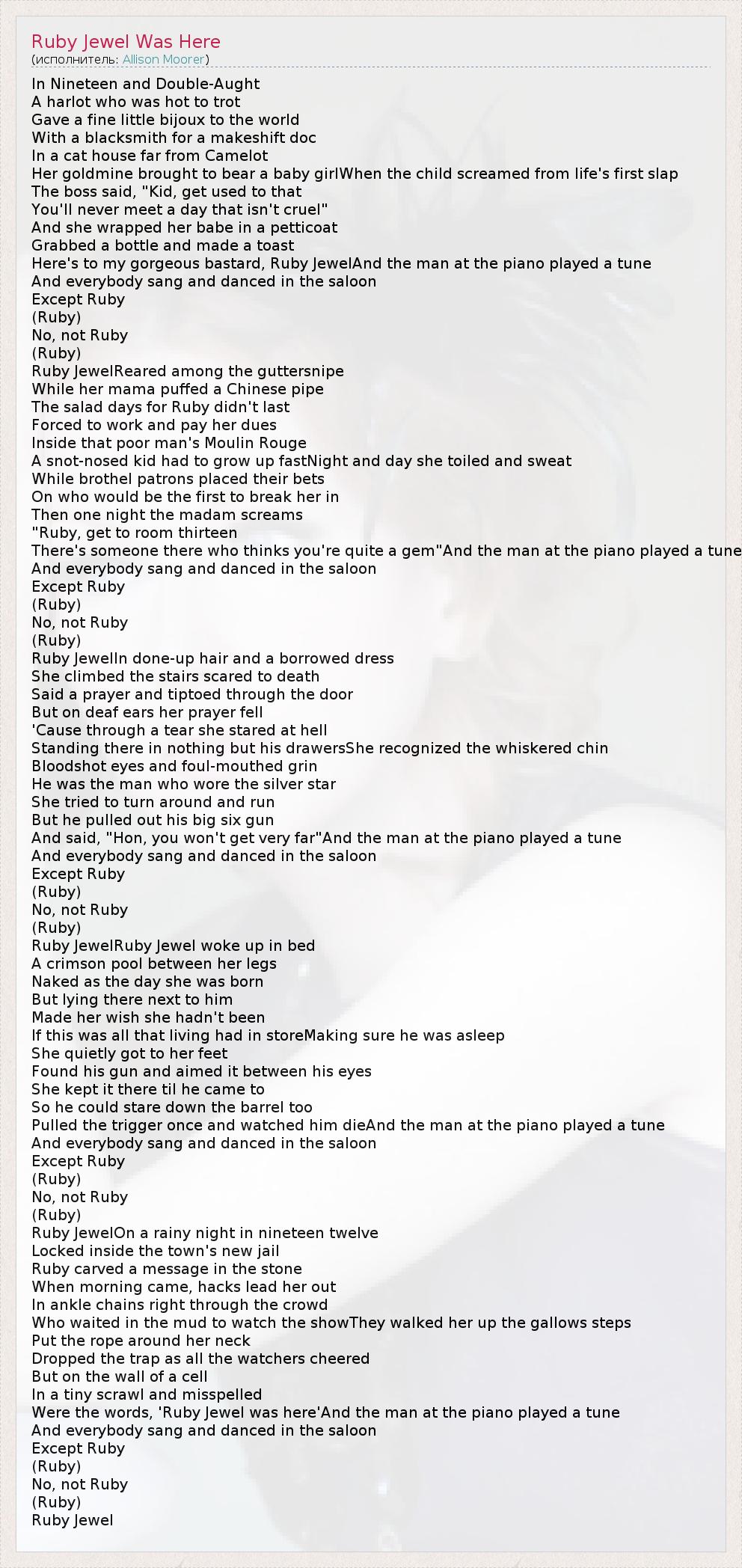 In Nineteen and Double-Aught A harlot who was hot to trot Gave a fine little bijoux to the world With a blacksmith for a makeshift doc In a cat house far from Camelot Her goldmine brought to bear a baby girlWhen the child screamed from life's first slap The boss said, "Kid, get used to that You'll never meet a day that isn't cruel" And she wrapped her babe in a petticoat Grabbed a bottle and made a toast Here's to my gorgeous bastard, Ruby JewelAnd the man at the piano played a tune And everybody sang and danced in the saloon Except Ruby (Ruby) No, not Ruby (Ruby) Ruby JewelReared among the guttersnipe While her mama puffed a Chinese pipe The salad days for Ruby didn't last Forced to work and pay her dues Inside that poor man's Moulin Rouge A snot-nosed kid had to grow up fastNight and day she toiled and sweat While brothel patrons placed their bets On who would be the first to break her in Then one night the madam screams "Ruby, get to room thirteen There's someone there who thinks you're quite a gem"And the man at the piano played a tune And everybody sang and danced in the saloon Except Ruby (Ruby) No, not Ruby (Ruby) Ruby JewelIn done-up hair and a borrowed dress She climbed the stairs scared to death Said a prayer and tiptoed through the door But on deaf ears her prayer fell 'Cause through a tear she stared at hell Standing there in nothing but his drawersShe recognized the whiskered chin Bloodshot eyes and foul-mouthed grin He was the man who wore the silver star She tried to turn around and run But he pulled out his big six gun And said, "Hon, you won't get very far"And the man at the piano played a tune And everybody sang and danced in the saloon Except Ruby (Ruby) No, not Ruby (Ruby) Ruby JewelRuby Jewel woke up in bed A crimson pool between her legs Naked as the day she was born But lying there next to him Made her wish she hadn't been If this was all that living had in storeMaking sure he was asleep She quietly got to her feet Found his gun and aimed it between his eyes She kept it there til he came to So he could stare down the barrel too Pulled the trigger once and watched him dieAnd the man at the piano played a tune And everybody sang and danced in the saloon Except Ruby (Ruby) No, not Ruby (Ruby) Ruby JewelOn a rainy night in nineteen twelve Locked inside the town's new jail Ruby carved a message in the stone When morning came, hacks lead her out In ankle chains right through the crowd Who waited in the mud to watch the showThey walked her up the gallows steps Put the rope around her neck Dropped the trap as all the watchers cheered But on the wall of a cell In a tiny scrawl and misspelled Were the words, 'Ruby Jewel was here'And the man at the piano played a tune And everybody sang and danced in the saloon Except Ruby (Ruby) No, not Ruby (Ruby) Ruby Jewel