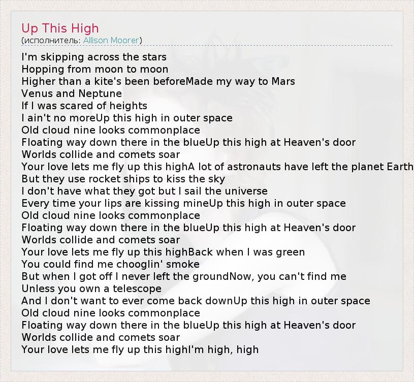 I'm skipping across the stars Hopping from moon to moon Higher than a kite's been beforeMade my way to Mars Venus and Neptune If I was scared of heights I ain't no moreUp this high in outer space Old cloud nine looks commonplace Floating way down there in the blueUp this high at Heaven's door Worlds collide and comets soar Your love lets me fly up this highA lot of astronauts have left the planet Earth But they use rocket ships to kiss the sky I don't have what they got but I sail the universe Every time your lips are kissing mineUp this high in outer space Old cloud nine looks commonplace Floating way down there in the blueUp this high at Heaven's door Worlds collide and comets soar Your love lets me fly up this highBack when I was green You could find me chooglin' smoke But when I got off I never left the groundNow, you can't find me Unless you own a telescope And I don't want to ever come back downUp this high in outer space Old cloud nine looks commonplace Floating way down there in the blueUp this high at Heaven's door Worlds collide and comets soar Your love lets me fly up this highI'm high, high