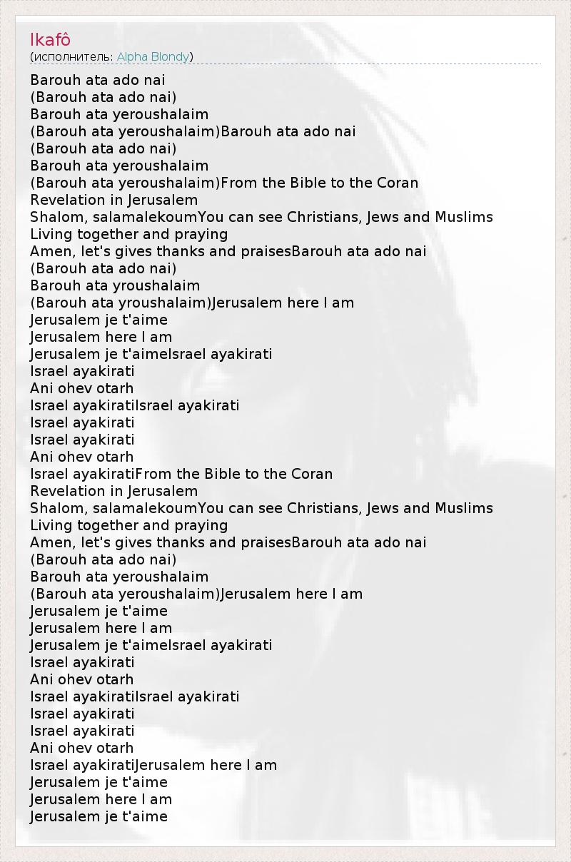 Barouh ata ado nai (Barouh ata ado nai) Barouh ata yeroushalaim (Barouh ata yeroushalaim)Barouh ata ado nai (Barouh ata ado nai) Barouh ata yeroushalaim (Barouh ata yeroushalaim)From the Bible to the Coran Revelation in Jerusalem Shalom, salamalekoumYou can see Christians, Jews and Muslims Living together and praying Amen, let's gives thanks and praisesBarouh ata ado nai (Barouh ata ado nai) Barouh ata yroushalaim (Barouh ata yroushalaim)Jerusalem here I am Jerusalem je t'aime Jerusalem here I am Jerusalem je t'aimeIsrael ayakirati Israel ayakirati Ani ohev otarh Israel ayakiratiIsrael ayakirati Israel ayakirati Israel ayakirati Ani ohev otarh Israel ayakiratiFrom the Bible to the Coran Revelation in Jerusalem Shalom, salamalekoumYou can see Christians, Jews and Muslims Living together and praying Amen, let's gives thanks and praisesBarouh ata ado nai (Barouh ata ado nai) Barouh ata yeroushalaim (Barouh ata yeroushalaim)Jerusalem here I am Jerusalem je t'aime Jerusalem here I am Jerusalem je t'aimeIsrael ayakirati Israel ayakirati Ani ohev otarh Israel ayakiratiIsrael ayakirati Israel ayakirati Israel ayakirati Ani ohev otarh Israel ayakiratiJerusalem here I am Jerusalem je t'aime Jerusalem here I am Jerusalem je t'aime