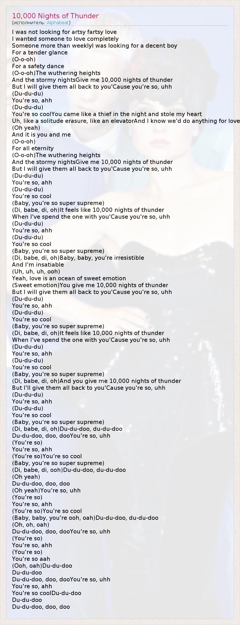 (Di, babe, di, oh)And you give me 10,000 nights of thunder