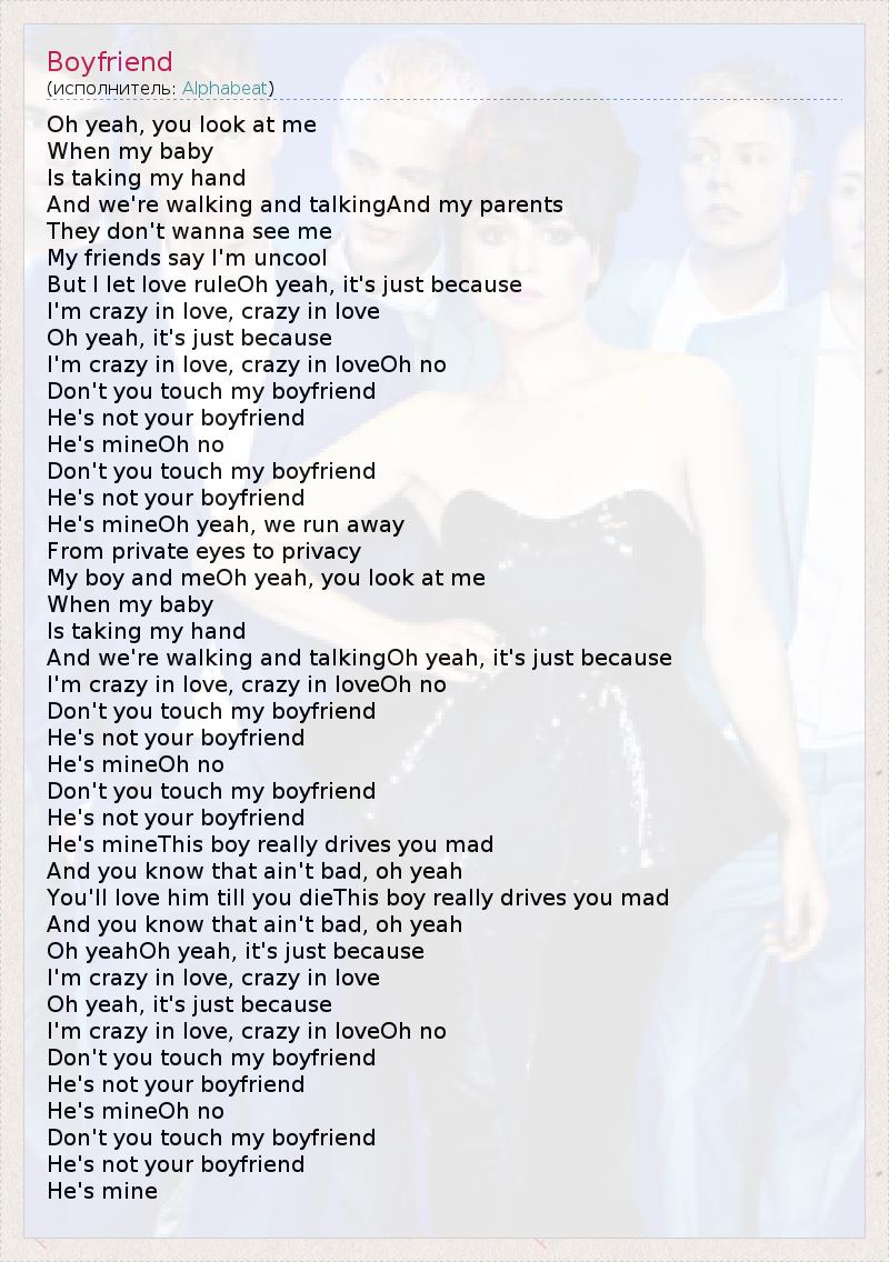 Oh yeah, you look at me When my baby Is taking my hand And we're walking and talkingAnd my parents They don't wanna see me My friends say I'm uncool But I let love ruleOh yeah, it's just because I'm crazy in love, crazy in love Oh yeah, it's just because I'm crazy in love, crazy in loveOh no Don't you touch my boyfriend He's not your boyfriend He's mineOh no Don't you touch my boyfriend He's not your boyfriend He's mineOh yeah, we run away From private eyes to privacy My boy and meOh yeah, you look at me When my baby Is taking my hand And we're walking and talkingOh yeah, it's just because I'm crazy in love, crazy in loveOh no Don't you touch my boyfriend He's not your boyfriend He's mineOh no Don't you touch my boyfriend He's not your boyfriend He's mineThis boy really drives you mad And you know that ain't bad, oh yeah You'll love him till you dieThis boy really drives you mad And you know that ain't bad, oh yeah Oh yeahOh yeah, it's just because I'm crazy in love, crazy in love Oh yeah, it's just because I'm crazy in love, crazy in loveOh no Don't you touch my boyfriend He's not your boyfriend He's mineOh no Don't you touch my boyfriend He's not your boyfriend He's mine
