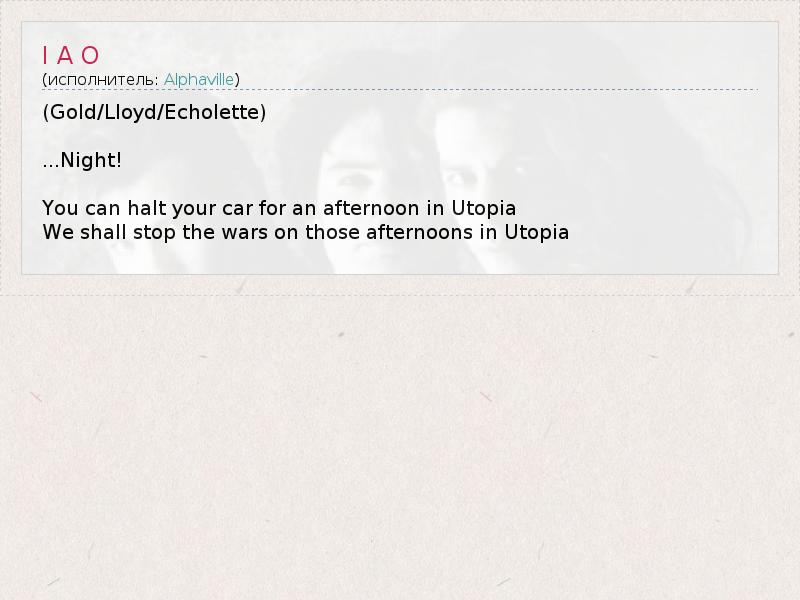 Это интересно:Alphaville — немецкая синти-поп-группа. Возникла в 1984 году в составе: Мариан Голд (Marian Gold) (р. 26 мая 1958 г.; вокал); Бернхард Ллойд (Bernhard Lloyd) (2 февраля 1960 г.), Фрэнк Мертенс (Frank Mertens) (26 октября 1961 г.); Рикки Эколетт (Ricky Echolette) (клавишные). Все началось с того, что Мариан и Бернхард в 1982 году покинули группу Nelson Project и вместе с Фрэнком, давним другом Бернхарда, начали писать популярную в то время... продолжение