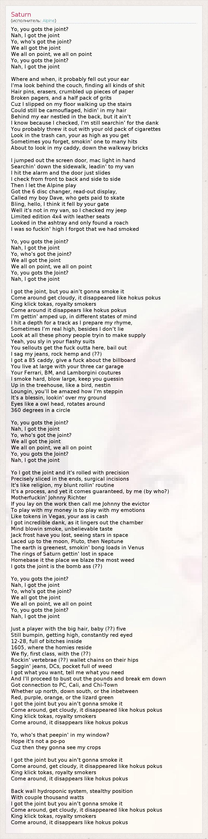 Yo, you gots the joint? Nah, I got the joint Yo, who's got the joint? We all got the joint We all on point, we all on point Yo, you gots the Joint? Nah, I got the joint Where and when, it probably fell out your ear I'ma look behind the couch, finding all kinds of shit Hair pins, erasers, crumbled up pieces of paper Broken pagers, and a half pack of grits Cuz I slipped on my floor walking up the stairs Could still be camouflaged, hidin' in my hair Behind my ear nestled in the back, but it ain't I know because I checked, I'm still searchin' for the dank You probably threw it out with your old pack of cigarettes Look in the trash can, your as high as you get Sometimes you forget, smokin' one to many hits About to look in my caddy, down the walkway bricks I jumped out the screen door, mac light in hand Searchin' down the sidewalk, leadin' to my van I hit the alarm and the door just slides I check from front to back and side to side Then I let the Alpine play Got the 6 disc changer, read-out display, Called my boy Dave, who gets paid to skate Bling, hello, I think it fell by your gate Well it's not in my van, so I checked my jeep Limited edition 4x4 with leather seats Looked in the ashtray and only found a roach I was so fuckin' high I forgot that we had smoked Yo, you gots the joint? Nah, I got the joint Yo, who's got the joint? We all got the joint We all on point, we all on point Yo, you gots the Joint? Nah, I got the joint I got the joint, but you ain't gonna smoke it Come around get cloudy, it disappeared like hokus pokus King klick tokas, royalty smokers Come around it disappears like hokus pokus I'm gettin' amped up, in different states of mind I hit a depth for a track as I prepare my rhyme, Sometimes I'm real high, besides I don't lie Look at all these phony people tryin to make supply Yeah, you sly in your flashy suits You sellouts get the fuck outta here, bail out I sag my jeans, rock hemp and (??) I got a 85 caddy, give a fuck about the billboard You live at large with your three car garage Your Ferrari, BM, and Lamborgini coutures I smoke hard, blow large, keep you guessin Up in the treehouse, like a bird, nestin Loungin, you'll be amazed how I'm steppin It's a blessin, lookin' over my ground Eyes like a owl head, rotates around 360 degrees in a circle Yo, you gots the joint? Nah, I got the joint Yo, who's got the joint? We all got the joint We all on point, we all on point Yo, you gots the Joint? Nah, I got the joint Yo I got the joint and it's rolled with precision Precisely sliced in the ends, surgical incisions It's like religion, my blunt rollin' routine It's a process, and yet it comes guaranteed, by me (by who?) Motherfuckin' Johnny Richter If you lay on the work then call me Johnny the evictor To play with my money is to play with my emotions Like tokens in Vegas, your ass is cash I got incredible dank, as it lingers out the chamber Mind blowin smoke, unbelievable taste Jack frost have you lost, seeing stars in space Laced up to the moon, Pluto, then Neptune The earth is greenest, smokin' bong loads in Venus The rings of Saturn gettin' lost in space Homebase it the place we blaze the most weed I gots the joint is the bomb ass (??) Yo, you gots the joint? Nah, I got the joint Yo, who's got the joint? We all got the joint We all on point, we all on point Yo, you gots the Joint? Nah, I got the joint Just a player with the big hair, baby (??) five Still bumpin, getting high, constantly red eyed 12-28, full of bitches inside 1605, where the homies reside We fly, first class, with the (??) Rockin' vertebrae (??) wallet chains on their hips Saggin' jeans, DCs, pocket full of weed I got what you want, tell me what you need And I'll proceed to bust out the pounds and break em down Got connection to PC, Cali, and Chi-Town Whether up north, down south, or the inbetween Red, purple, orange, or the lizard green I got the joint but you ain't gonna smoke it Come around, get cloudy, it disappeared like hokus pokus King klick tokas, royalty smokers Come around, it disappears like hokus pokus Yo, who's that peepin' in my window? Hope it's not a po-po Cuz then they gonna see my crops I got the joint but you ain't gonna smoke it Come around, get cloudy, it disappeared like hokus pokus King klick tokas, royalty smokers Come around, it disappears like hokus pokus Back wall hydroponic system, stealthy position With couple thousand watts I got the joint but you ain't gonna smoke it Come around, get cloudy, it disappeared like hokus pokus King klick tokas, royalty smokers Come around, it disappears like hokus pokus