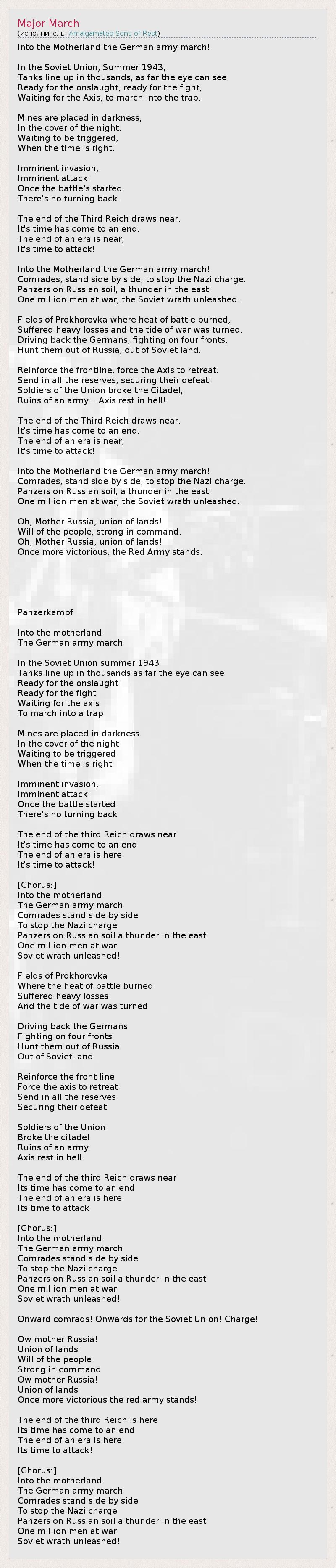 Into the Motherland the German army march! In the Soviet Union, Summer 1943, Tanks line up in thousands, as far the eye can see. Ready for the onslaught, ready for the fight, Waiting for the Axis, to march into the trap. Mines are placed in darkness, In the cover of the night. Waiting to be triggered, When the time is right. Imminent invasion, Imminent attack. Once the battle's started There's no turning back. The end of the Third Reich draws near. It's time has come to an end. The end of an era is near, It's time to attack! Into the Motherland the German army march! Comrades, stand side by side, to stop the Nazi charge. Panzers on Russian soil, a thunder in the east. One million men at war, the Soviet wrath unleashed. Fields of Prokhorovka where heat of battle burned, Suffered heavy losses and the tide of war was turned. Driving back the Germans, fighting on four fronts, Hunt them out of Russia, out of Soviet land. Reinforce the frontline, force the Axis to retreat. Send in all the reserves, securing their defeat. Soldiers of the Union broke the Citadel, Ruins of an army... Axis rest in hell! The end of the Third Reich draws near. It's time has come to an end. The end of an era is near, It's time to attack! Into the Motherland the German army march! Comrades, stand side by side, to stop the Nazi charge. Panzers on Russian soil, a thunder in the east. One million men at war, the Soviet wrath unleashed. Oh, Mother Russia, union of lands! Will of the people, strong in command. Oh, Mother Russia, union of lands! Once more victorious, the Red Army stands. Panzerkampf Into the motherland The German army march In the Soviet Union summer 1943 Tanks line up in thousands as far the eye can see Ready for the onslaught Ready for the fight Waiting for the axis To march into a trap Mines are placed in darkness In the cover of the night Waiting to be triggered When the time is right Imminent invasion, Imminent attack Once the battle started There's no turning back The end of the third Reich draws near It's time has come to an end The end of an era is here It's time to attack! [Chorus:] Into the motherland The German army march Comrades stand side by side To stop the Nazi charge Panzers on Russian soil a thunder in the east One million men at war Soviet wrath unleashed! Fields of Prokhorovka Where the heat of battle burned Suffered heavy losses And the tide of war was turned Driving back the Germans Fighting on four fronts Hunt them out of Russia Out of Soviet land Reinforce the front line Force the axis to retreat Send in all the reserves Securing their defeat Soldiers of the Union Broke the citadel Ruins of an army Axis rest in hell The end of the third Reich draws near Its time has come to an end The end of an era is here Its time to attack [Chorus:] Into the motherland The German army march Comrades stand side by side To stop the Nazi charge Panzers on Russian soil a thunder in the east One million men at war Soviet wrath unleashed! Onward comrads! Onwards for the Soviet Union! Charge! Ow mother Russia! Union of lands Will of the people Strong in command Ow mother Russia! Union of lands Once more victorious the red army stands! The end of the third Reich is here Its time has come to an end The end of an era is here Its time to attack! [Chorus:] Into the motherland The German army march Comrades stand side by side To stop the Nazi charge Panzers on Russian soil a thunder in the east One million men at war Soviet wrath unleashed!