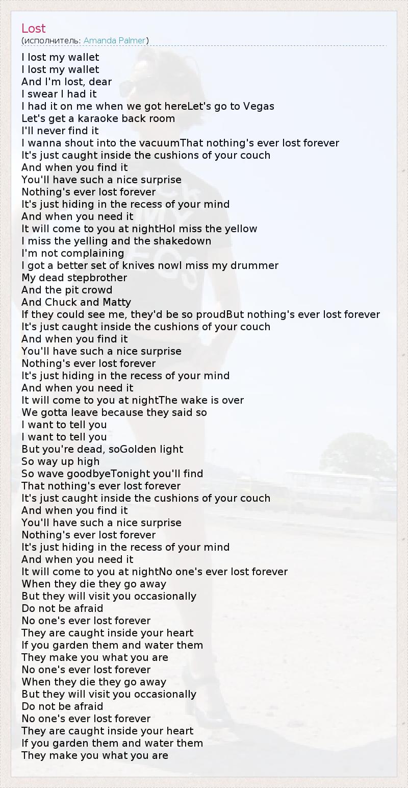 Это интересно:Аманда Палмер (родилась 30 апреля 1976 года) выросла в Лексингтоне, штат Массачусетс. С пяти лет, после того как мама показала ей несколько пьес Дебюсси и прелюдий Баха, Аманда часто усаживалась за пианино, импровизировала и сочиняла песенки. Читать ноты она так и не научилась. Когда ей было девять, в ее личной фонотеке начали появляться пластинки Beatles, Синди Лопер (Cyndi Lauper), Мадонны, Принса,... продолжение
