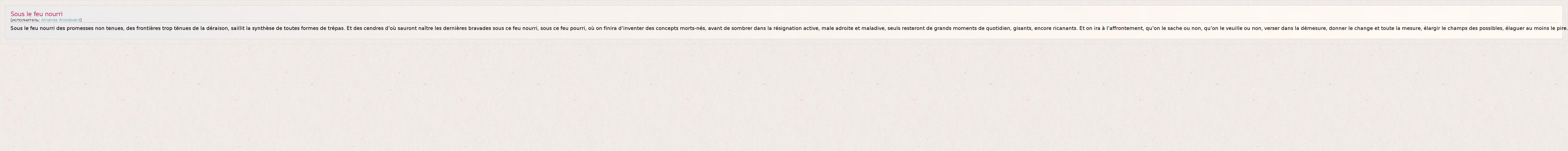 Sous le feu nourri des promesses non tenues, des frontières trop ténues de la déraison, saillit la synthèse de toutes formes de trépas. Et des cendres d'où sauront naître les dernières bravades sous ce feu nourri, sous ce feu pourri, où on finira d'inventer des concepts morts-nés, avant de sombrer dans la résignation active, male adroite et maladive, seuls resteront de grands moments de quotidien, gisants, encore ricanants. Et on ira à l'affrontement, qu'on le sache ou non, qu'on le veuille ou non, verser dans la démesure, donner le change et toute la mesure, élargir le champs des possibles, élaguer au moins le pire.