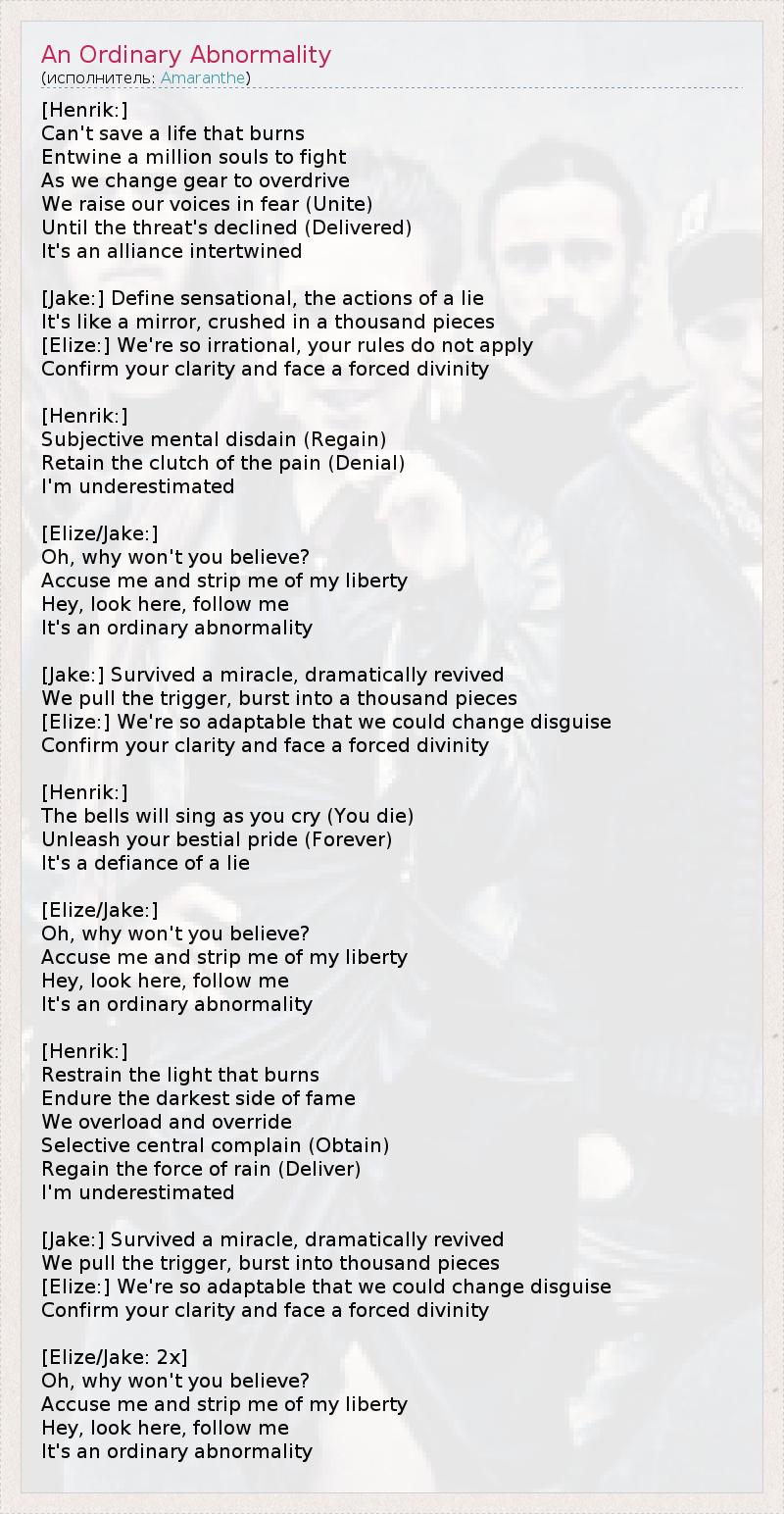 [Henrik:] Не можешь спасти жизнь в огне, Оплетаешь миллион душ, чтобы бороться, Пока мы переключаем передачу для разгона. Мы возносим наши голоса в страхе, (Сплачиваемся) Пока угроза не минует. (Сделано) Это взаимосвязанный альянс. [Jake:] Определи поразительное, поведение лжи - Это как зеркало, разбитое на тысячи осколков. [Elize:] Мы так иррациональны, твои правила не действуют. Подтверди ясность ума и столкнись с принудительной божественностью. [Henrik:] Субъективное психическое презрение (Возврат) Сохрани воспоминание о тисках боли (Отрицание) Меня недооценивают. [Elize/Jake:] О, почему же ты не веришь? Обвини меня и лиши свободы, Эй, смотри сюда, следуй за мной, Это обыкновенная аномалия. [Jake:] Чудом выжил, драматически возродился, Мы спускаем курок, взрываемся на тысячу осколков. [Elize:] Мы такие приспособленцы, что можем сменить маскировку. Подтверди ясность ума и столкнись с принудительной божественностью. [Henrik:] Колокола будут пет, пока ты кричишь (Ты умираешь), Дай волю своей звериной гордости (Навечно), Это неповиновение обмана. [Elize/Jake:] О, почему же ты не веришь? Обвини меня и лиши свободы, Эй, смотри сюда, следуй за мной, Это обыкновенная аномалия. [Henrik:] Сдержи горящий свет, Переживи самую тёмную сторону славы, Мы разгоняем и переопределяем Избирательные центральные жалобы (Получай), Восстанавливай силы дождя (Доставляй). Меня недооценили. [Jake:] Чудом выжил, драматически возродился, Мы спускаем курок, взрываемся на тысячу осколков. [Elize:] Мы такие приспособленцы, что можем сменить маскировку. Подтверди ясность ума и столкнись с принудительной божественностью. [Elize/Jake: 2x] О, почему же ты не веришь? Обвини меня и лиши свободы, Эй, смотри сюда, следуй за мной, Это обыкновенная аномалия.