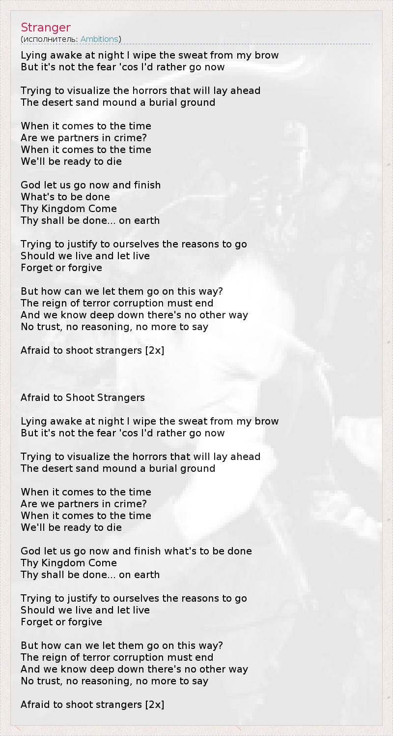 Lying awake at night I wipe the sweat from my brow But it's not the fear 'cos I'd rather go now Trying to visualize the horrors that will lay ahead The desert sand mound a burial ground When it comes to the time Are we partners in crime? When it comes to the time We'll be ready to die God let us go now and finish What's to be done Thy Kingdom Come Thy shall be done... on earth Trying to justify to ourselves the reasons to go Should we live and let live Forget or forgive But how can we let them go on this way? The reign of terror corruption must end And we know deep down there's no other way No trust, no reasoning, no more to say Afraid to shoot strangers [2x] Afraid to Shoot Strangers Lying awake at night I wipe the sweat from my brow But it's not the fear 'cos I'd rather go now Trying to visualize the horrors that will lay ahead The desert sand mound a burial ground When it comes to the time Are we partners in crime? When it comes to the time We'll be ready to die God let us go now and finish what's to be done Thy Kingdom Come Thy shall be done... on earth Trying to justify to ourselves the reasons to go Should we live and let live Forget or forgive But how can we let them go on this way? The reign of terror corruption must end And we know deep down there's no other way No trust, no reasoning, no more to say Afraid to shoot strangers [2x]