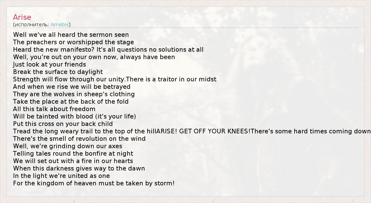 Tread the long weary trail to the top of the hillARISE! GET OFF YOUR KNEES!There's some hard times coming down