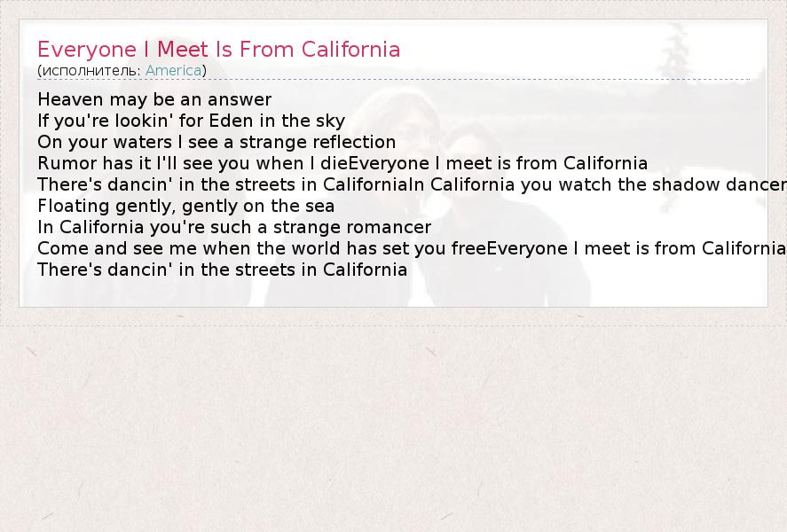 Heaven may be an answer If you're lookin' for Eden in the sky On your waters I see a strange reflection Rumor has it I'll see you when I dieEveryone I meet is from California There's dancin' in the streets in CaliforniaIn California you watch the shadow dancer Floating gently, gently on the sea In California you're such a strange romancer Come and see me when the world has set you freeEveryone I meet is from California There's dancin' in the streets in California