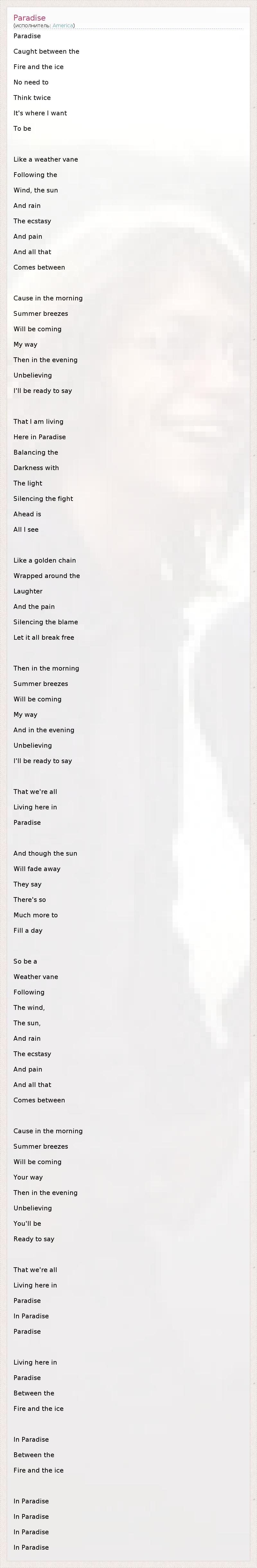 Paradise Caught between the Fire and the ice No need to Think twice It's where I want To be Like a weather vane Following the Wind, the sun And rain The ecstasy And pain And all that Comes between Cause in the morning Summer breezes Will be coming My way Then in the evening Unbelieving I'll be ready to say That I am living Here in Paradise Balancing the Darkness with The light Silencing the fight Ahead is All I see Like a golden chain Wrapped around the Laughter And the pain Silencing the blame Let it all break free Then in the morning Summer breezes Will be coming My way And in the evening Unbelieving I'll be ready to say That we're all Living here in Paradise And though the sun Will fade away They say There's so Much more to Fill a day So be a Weather vane Following The wind, The sun, And rain The ecstasy And pain And all that Comes between Cause in the morning Summer breezes Will be coming Your way Then in the evening Unbelieving You'll be Ready to say That we're all Living here in Paradise In Paradise Paradise Living here in Paradise Between the Fire and the ice In Paradise Between the Fire and the ice In Paradise In Paradise In Paradise In Paradise
