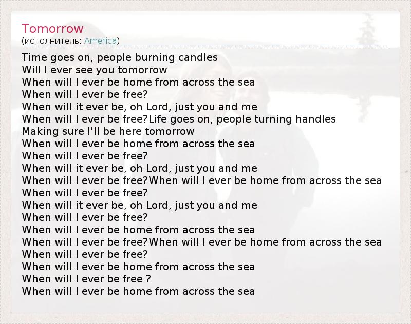 Time goes on, people burning candles Will I ever see you tomorrow When will I ever be home from across the sea When will I ever be free? When will it ever be, oh Lord, just you and me When will I ever be free?Life goes on, people turning handles Making sure I'll be here tomorrow When will I ever be home from across the sea When will I ever be free? When will it ever be, oh Lord, just you and me When will I ever be free?When will I ever be home from across the sea When will I ever be free? When will it ever be, oh Lord, just you and me When will I ever be free? When will I ever be home from across the sea When will I ever be free?When will I ever be home from across the sea When will I ever be free? When will I ever be home from across the sea When will I ever be free ? When will I ever be home from across the sea