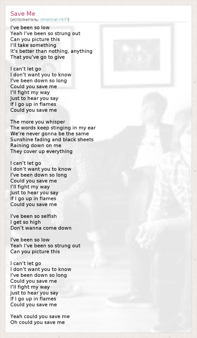 I've been so low Yeah I've been so strung out Can you picture this I'll take something It's better than nothing, anything That you've go to give I can't let go I don't want you to know I've been down so long Could you save me I'll fight my way Just to hear you say If I go up in flames Could you save me The more you whisper The words keep stinging in my ear We're never gonna be the same Sunshine fading and black sheets Raining down on me They cover up everything I can't let go I don't want you to know I've been down so long Could you save me I'll fight my way Just to hear you say If I go up in flames Could you save me I've been so selfish I get so high Don't wanna come down I've been so low Yeah I've been so strung out Can you picture this I can't let go I don't want you to know I've been down so long Could you save me I'll fight my way Just to hear you say If I go up in flames Could you save me Yeah could you save me Oh could you save me