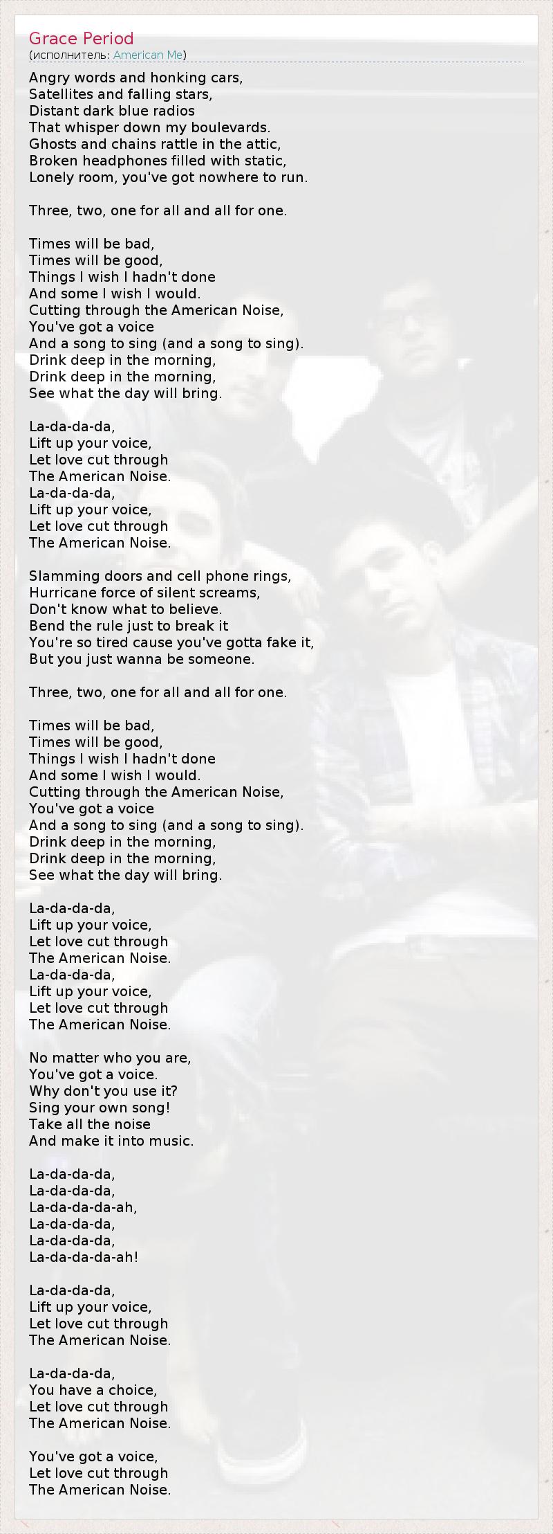 Злые слова и гудящие машины, Спутники и падающие звезды, Радио в далекой синеве Шепчут на моих бульварах. Призраки и цепи гремят на чердаке, Сломанные наушники заполнены помехами, Пустующая комната, тебе некуда бежать. Три, два, один за всех и все за одного. Будут времена плохие, Будут времена хорошие, То, о чём я сожалею, И то, что хотел бы сделать. У тебя есть голос, Прорывающийся сквозь Американский шум, И песня, чтобы спеть (и песня, чтобы спеть). Сделай большой глоток с утра, Сделай большой глоток с утра, Посмотри, что принесет день. Ла-да-да-да, Возвысь свой голос, Позволь любви прорваться Сквозь Американский шум. Ла-да-да-да, Возвысь свой голос, Позволь любви прорваться Сквозь Американский шум. Хлопающие двери и телефонные звонки, Ураганная сила беззвучных криков, Не знаешь, чему верить. Нарушь правило, чтобы сломить его, Ты так устал от того, что нужно притворяться, Но ты просто хочешь быть кем-то. Три, два, один за всех и все за одного. Будут времена плохие, Будут времена хорошие, То, о чём я сожалею, И то, что хотел бы сделать. У тебя есть голос, Прорывающийся сквозь Американский шум, И песня, чтобы спеть (и песня, чтобы спеть). Сделай большой глоток с утра, Сделай большой глоток с утра, Посмотри, что день принесет. Ла-да-да-да, Возвысь свой голос, Позволь любви прорваться Сквозь Американский шум. Ла-да-да-да, Возвысь свой голос, Позволь любви прорваться Сквозь Американский шум. Неважно, кто ты есть, У тебя есть голос. Почему не используешь его? Спой свою песню! Собери весь шум И преврати его в песню. Ла-да-да-да, Ла-да-да-да, Ла-да-да-да-а, Ла-да-да-да, Ла-да-да-да, Ла-да-да-да-а! Ла-да-да-да, Возвысь свой голос, Позволь любви прорваться Сквозь Американский шум. Ла-да-да-да, У тебя есть выбор, Позволь любви прорваться Сквозь Американский шум. У тебя есть голос, Позволь любви прорваться Сквозь Американский шум.