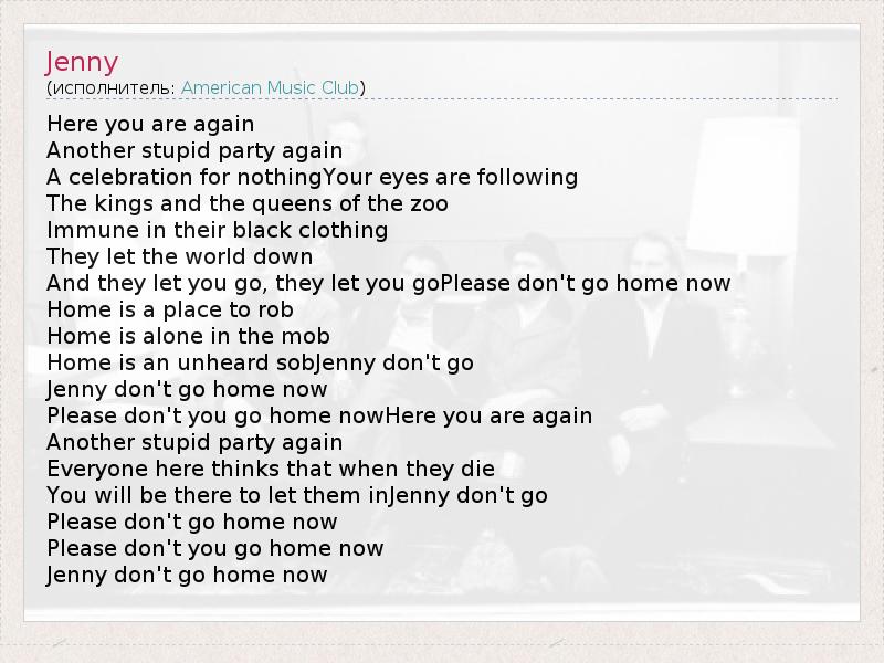 Here you are again Another stupid party again A celebration for nothingYour eyes are following The kings and the queens of the zoo Immune in their black clothing They let the world down And they let you go, they let you goPlease don't go home now Home is a place to rob Home is alone in the mob Home is an unheard sobJenny don't go Jenny don't go home now Please don't you go home nowHere you are again Another stupid party again Everyone here thinks that when they die You will be there to let them inJenny don't go Please don't go home now Please don't you go home now Jenny don't go home now