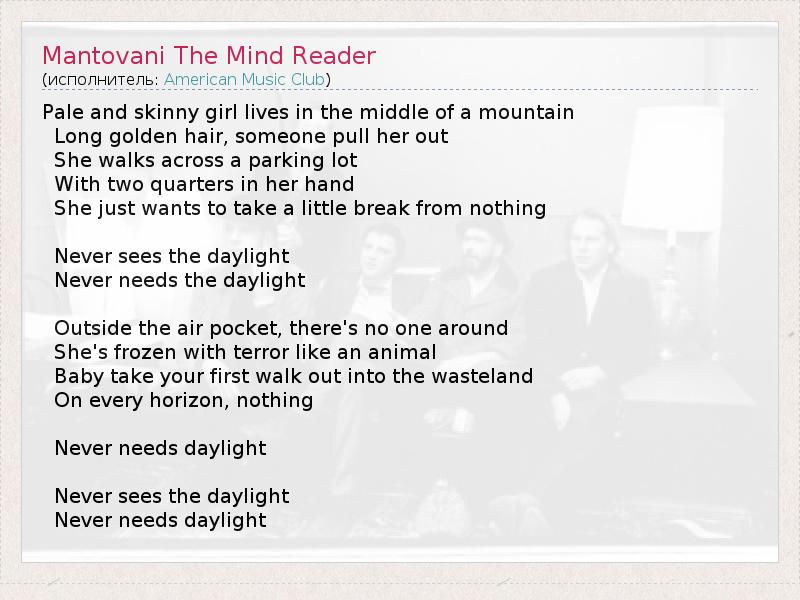А как ты думаешь, о чем песня "Mantovani The Mind Reader" ?