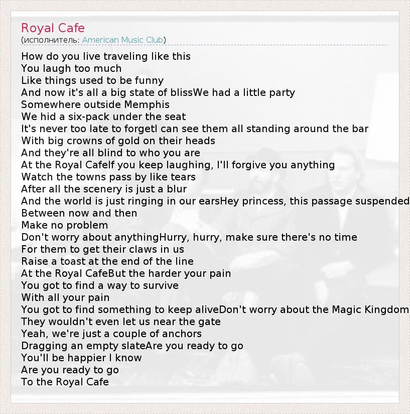 How do you live traveling like this You laugh too much Like things used to be funny And now it's all a big state of blissWe had a little party Somewhere outside Memphis We hid a six-pack under the seat It's never too late to forgetI can see them all standing around the bar With big crowns of gold on their heads And they're all blind to who you are At the Royal CafeIf you keep laughing, I'll forgive you anything Watch the towns pass by like tears After all the scenery is just a blur And the world is just ringing in our earsHey princess, this passage suspended Between now and then Make no problem Don't worry about anythingHurry, hurry, make sure there's no time For them to get their claws in us Raise a toast at the end of the line At the Royal CafeBut the harder your pain You got to find a way to survive With all your pain You got to find something to keep aliveDon't worry about the Magic Kingdom They wouldn't even let us near the gate Yeah, we're just a couple of anchors Dragging an empty slateAre you ready to go You'll be happier I know Are you ready to go To the Royal Cafe