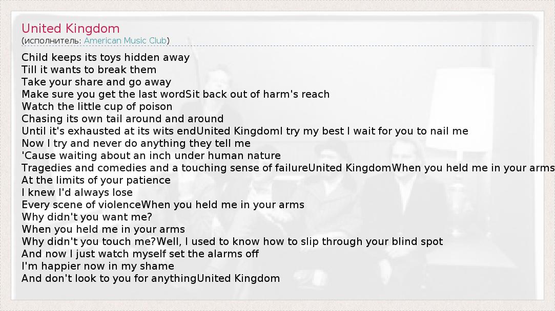 Это интересно:American Music Club (часто сокращают как AMC) – группа из Сан-Франциско, возглавляемая вокалистом и автором слов Марком Эйтцелем (Mark Eitzel). Группа записывалась и играла в клубах Сан-Франциско с середины 80-х, отличившись невероятным долголетием благодаря не финансовой успешности, а вниманию критиков.Несмотря на то, что группу часто причисляют к течениям слоукор/slowcore и сэдкор/sadcore и сравнивают... продолжение