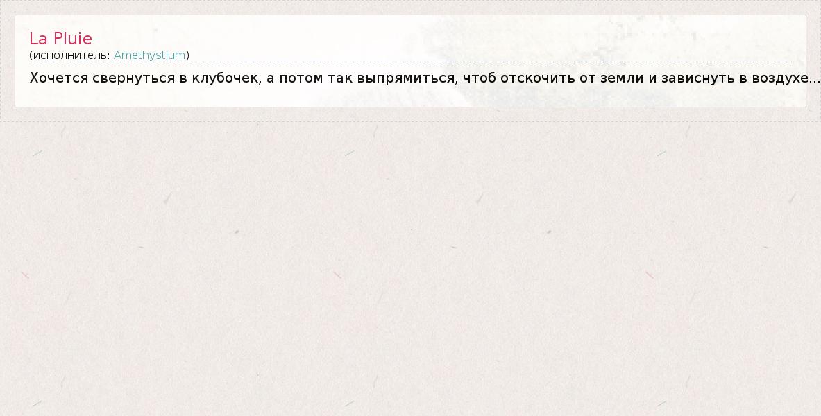 Это интересно:Amethystium - это музыкальный проект, направленный на создание и исследование эмоциональных воображаемых миров в звуке. Главным образом, основанные на электронном звучании композиции переливаются различными настроениями, которые включают обе стороны, свет и тьму, блаженство и меланхолию, простираясь от исключительно расслабляющих до утонченно напряженных, создавая сказочные фантастические... продолжение