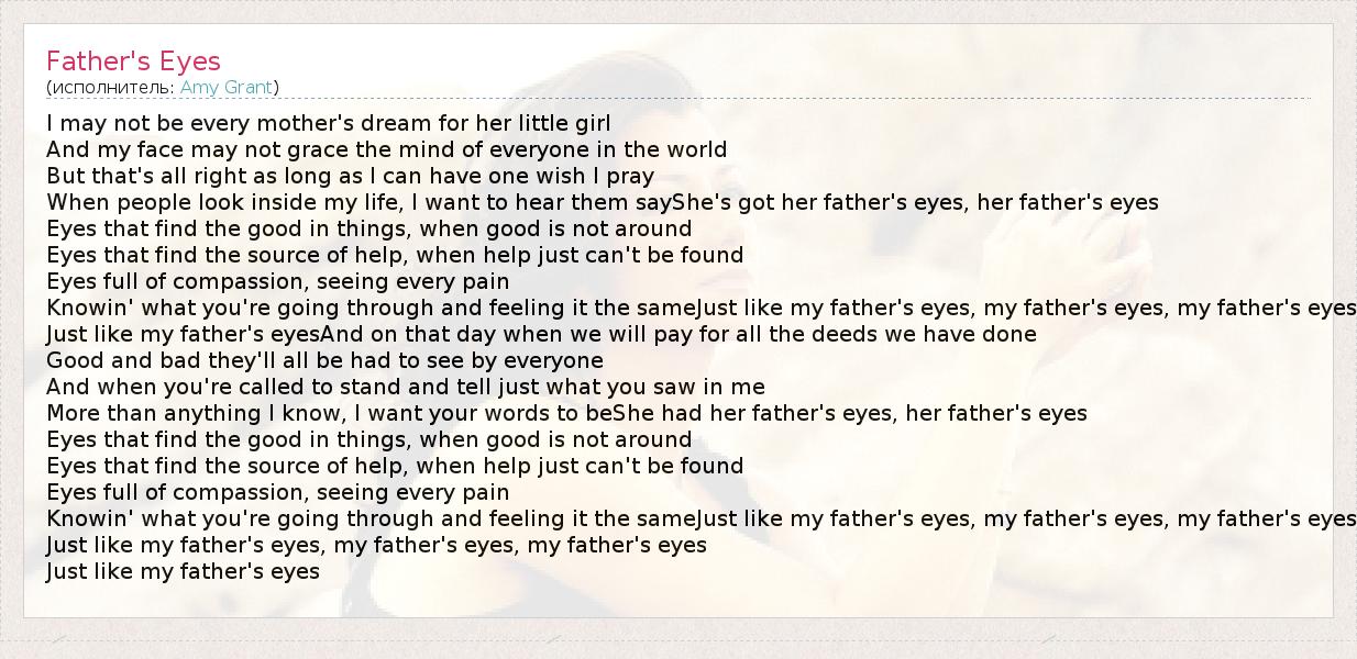 I may not be every mother's dream for her little girl And my face may not grace the mind of everyone in the world But that's all right as long as I can have one wish I pray When people look inside my life, I want to hear them sayShe's got her father's eyes, her father's eyes Eyes that find the good in things, when good is not around Eyes that find the source of help, when help just can't be found Eyes full of compassion, seeing every pain Knowin' what you're going through and feeling it the sameJust like my father's eyes, my father's eyes, my father's eyes Just like my father's eyesAnd on that day when we will pay for all the deeds we have done Good and bad they'll all be had to see by everyone And when you're called to stand and tell just what you saw in me More than anything I know, I want your words to beShe had her father's eyes, her father's eyes Eyes that find the good in things, when good is not around Eyes that find the source of help, when help just can't be found Eyes full of compassion, seeing every pain Knowin' what you're going through and feeling it the sameJust like my father's eyes, my father's eyes, my father's eyes Just like my father's eyes, my father's eyes, my father's eyes Just like my father's eyes