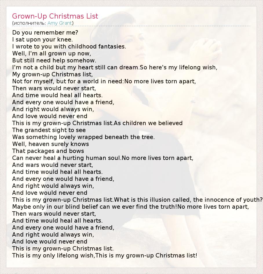 Do you remember me? I sat upon your knee. I wrote to you with childhood fantasies. Well, I'm all grown up now, But still need help somehow. I'm not a child but my heart still can dream.So here's my lifelong wish, My grown-up Christmas list, Not for myself, but for a world in need:No more lives torn apart, Then wars would never start, And time would heal all hearts. And every one would have a friend, And right would always win, And love would never end This is my grown-up Christmas list.As children we believed The grandest sight to see Was something lovely wrapped beneath the tree. Well, heaven surely knows That packages and bows Can never heal a hurting human soul.No more lives torn apart, And wars would never start, And time would heal all hearts. And every one would have a friend, And right would always win, And love would never end This is my grown-up Christmas list.What is this illusion called, the innocence of youth? Maybe only in our blind belief can we ever find the truth!No more lives torn apart, Then wars would never start, And time would heal all hearts. And every one would have a friend, And right would always win, And love would never end This is my grown-up Christmas list. This is my only lifelong wish,This is my grown-up Christmas list!