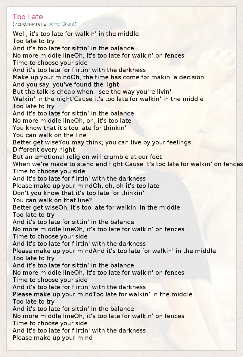 Walkin' in the night'Cause it's too late for walkin' in the middle