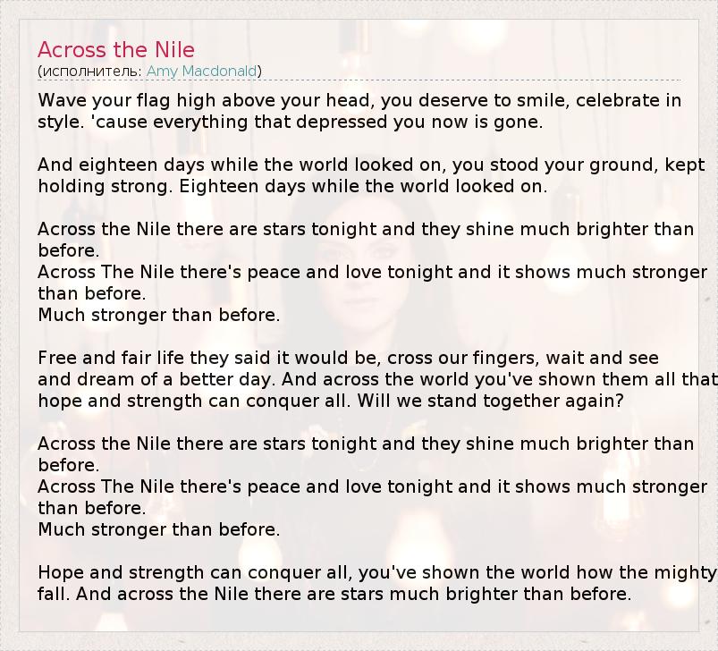 А как ты думаешь, о чем песня "Across the Nile" ?