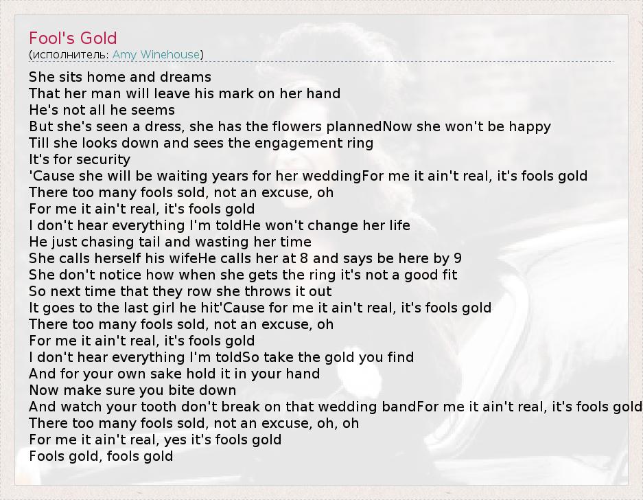 She sits home and dreams That her man will leave his mark on her hand He's not all he seems But she's seen a dress, she has the flowers plannedNow she won't be happy Till she looks down and sees the engagement ring It's for security 'Cause she will be waiting years for her weddingFor me it ain't real, it's fools gold There too many fools sold, not an excuse, oh For me it ain't real, it's fools gold I don't hear everything I'm toldHe won't change her life He just chasing tail and wasting her time She calls herself his wifeHe calls her at 8 and says be here by 9 She don't notice how when she gets the ring it's not a good fit So next time that they row she throws it out It goes to the last girl he hit'Cause for me it ain't real, it's fools gold There too many fools sold, not an excuse, oh For me it ain't real, it's fools gold I don't hear everything I'm toldSo take the gold you find And for your own sake hold it in your hand Now make sure you bite down And watch your tooth don't break on that wedding bandFor me it ain't real, it's fools gold There too many fools sold, not an excuse, oh, oh For me it ain't real, yes it's fools gold Fools gold, fools gold