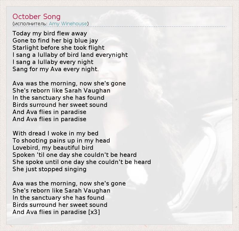 Сегодня моя пташка улетела прочь, Упорхнула, чтобы отыскать свою большую голубую сойку. Сияли звезды перед тем, как улетела. Каждую ночь я пела "Колыбельную Страны Птиц", 1 Каждую ночь я пела колыбельную, Каждую ночь пела для своей Авы. 2 Ава была утренней зарей, теперь ее нет. Она переродилась, как Сара Вон. 3 В святилище она обнаружила птиц, Которые окружили ее сладостными звуками. И Ава летает в раю. И Ава летает в раю. С ужасом я проснулась в своей постели. Боль дважды пронзила мне голову. Голубка моя, моя прекрасная пташка Говорила, пока однажды ее перестали слышать, Она говорила, пока однажды ее перестали слышать, Она просто перестала петь. Ава была утренней зарей, теперь ее нет. Она переродилась, как Сара Вон. В святилище она обнаружила птиц, Которые окружили ее сладостными звуками. И Ава летает в раю. [x3] 1 - популярная песня, написанная в 1952 году. Ее исполняли многие певцы и музыканты, в числе которых Элла Фицджеральд, Сара Вон и другие. 2 - женское имя, в переводе на русский может произноситься по-разному: "Ава", "Авэ", "Эйва". 3 - одна из величайших джазовых вокалисток XX-го века.