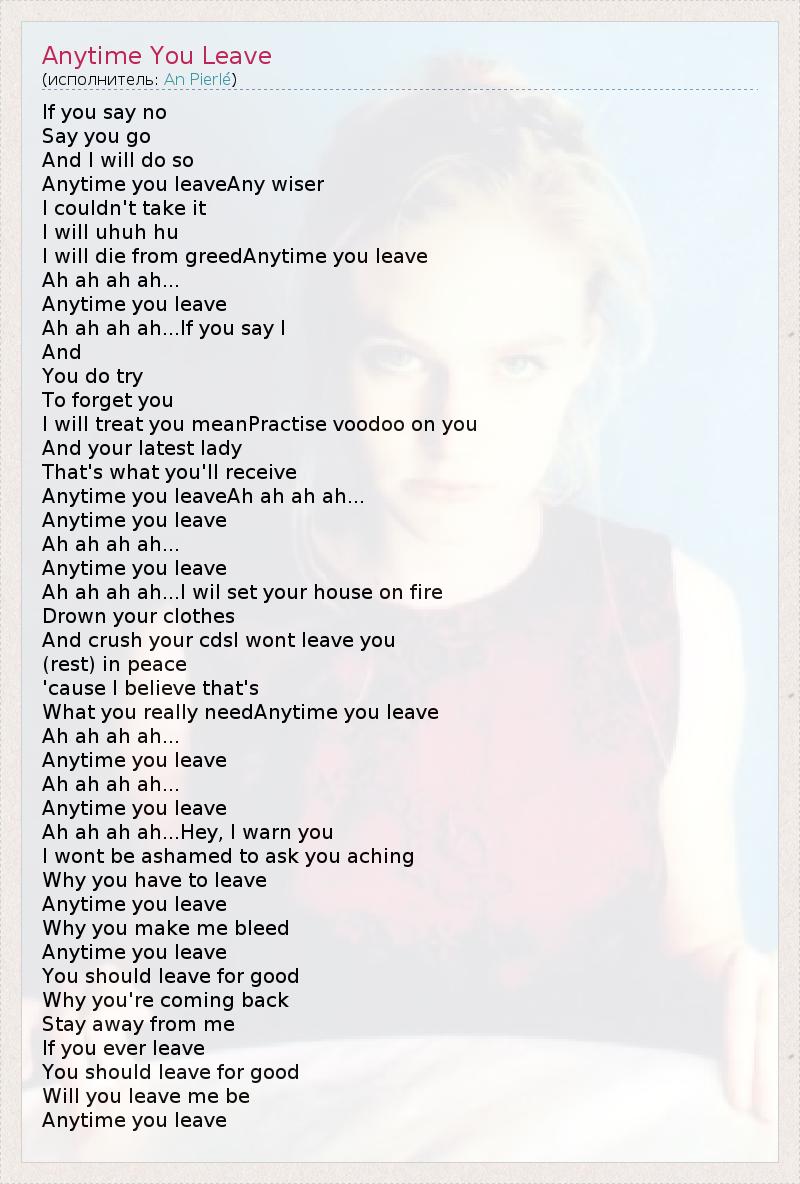 If you say no Say you go And I will do so Anytime you leaveAny wiser I couldn't take it I will uhuh hu I will die from greedAnytime you leave Ah ah ah ah... Anytime you leave Ah ah ah ah...If you say I And You do try To forget you I will treat you meanPractise voodoo on you And your latest lady That's what you'll receive Anytime you leaveAh ah ah ah... Anytime you leave Ah ah ah ah... Anytime you leave Ah ah ah ah...I wil set your house on fire Drown your clothes And crush your cdsI wont leave you (rest) in peace 'cause I believe that's What you really needAnytime you leave Ah ah ah ah... Anytime you leave Ah ah ah ah... Anytime you leave Ah ah ah ah...Hey, I warn you I wont be ashamed to ask you aching Why you have to leave Anytime you leave Why you make me bleed Anytime you leave You should leave for good Why you're coming back Stay away from me If you ever leave You should leave for good Will you leave me be Anytime you leave
