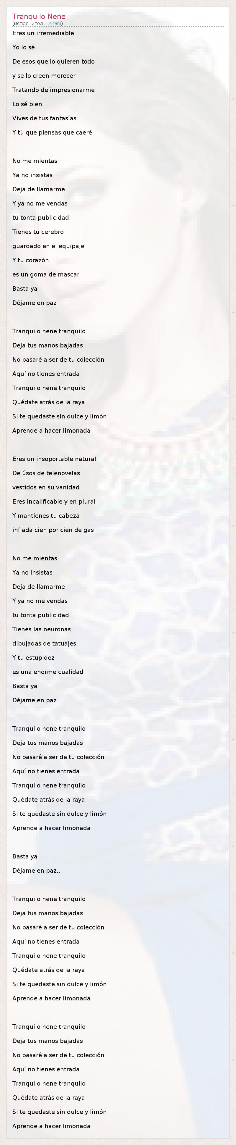Eres un irremediable Yo lo sé De esos que lo quieren todo y se lo creen merecer Tratando de impresionarme Lo sé bien Vives de tus fantasías Y tú que piensas que caeré No me mientas Ya no insistas Deja de llamarme Y ya no me vendas tu tonta publicidad Tienes tu cerebro guardado en el equipaje Y tu corazón es un goma de mascar Basta ya Déjame en paz Tranquilo nene tranquilo Deja tus manos bajadas No pasaré a ser de tu colección Aquí no tienes entrada Tranquilo nene tranquilo Quédate atrás de la raya Si te quedaste sin dulce y limón Aprende a hacer limonada Eres un insoportable natural De úsos de telenovelas vestidos en su vanidad Eres incalificable y en plural Y mantienes tu cabeza inflada cien por cien de gas No me mientas Ya no insistas Deja de llamarme Y ya no me vendas tu tonta publicidad Tienes las neuronas dibujadas de tatuajes Y tu estupidez es una enorme cualidad Basta ya Déjame en paz Tranquilo nene tranquilo Deja tus manos bajadas No pasaré a ser de tu colección Aquí no tienes entrada Tranquilo nene tranquilo Quédate atrás de la raya Si te quedaste sin dulce y limón Aprende a hacer limonada Basta ya Déjame en paz... Tranquilo nene tranquilo Deja tus manos bajadas No pasaré a ser de tu colección Aquí no tienes entrada Tranquilo nene tranquilo Quédate atrás de la raya Si te quedaste sin dulce y limón Aprende a hacer limonada Tranquilo nene tranquilo Deja tus manos bajadas No pasaré a ser de tu colección Aquí no tienes entrada Tranquilo nene tranquilo Quédate atrás de la raya Si te quedaste sin dulce y limón Aprende a hacer limonada