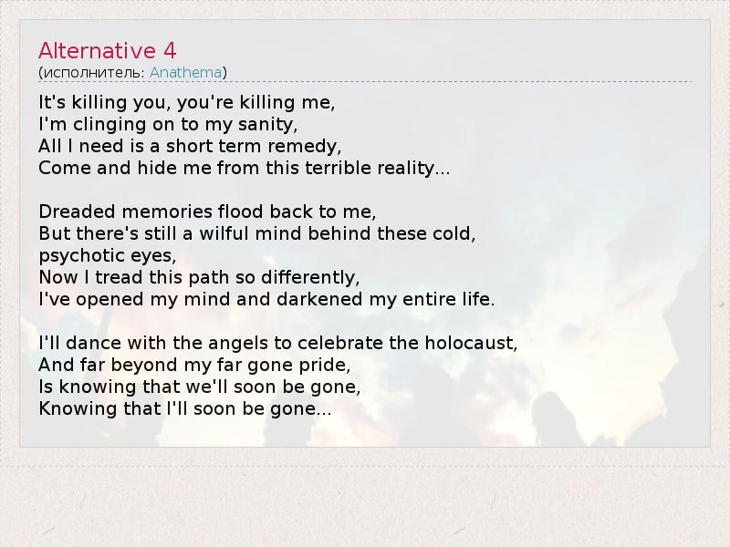 "Альтернатива" Это убивает тебя, ты убиваешь меня. Я цепляюсь за остатки здравого ума. Мне необходимо пусть короткое, но излечение, Спрячь от жуткой реальности хоть на мгновение. Пугающие воспоминания снова меня переполняют, Но упрямый разум прячут холодные глаза. Иначе, чем тогда, по той дороге я вперёд шагаю, Очернил совершенную жизнь и расширил стены разума. Я буду танцевать с ангелами, чтобы отпраздновать свой холокост В стороне от моей далеко зашедшей гордости. Знаю, что вскоре мы уйдём, Знаю, что в скором времени уйду...