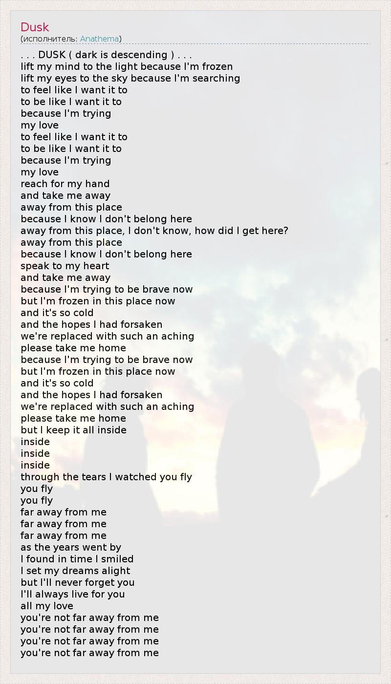 . . . DUSK ( dark is descending ) . . . lift my mind to the light because I'm frozen lift my eyes to the sky because I'm searching to feel like I want it to to be like I want it to because I'm trying my love to feel like I want it to to be like I want it to because I'm trying my love reach for my hand and take me away away from this place because I know I don't belong here away from this place, I don't know, how did I get here? away from this place because I know I don't belong here speak to my heart and take me away because I'm trying to be brave now but I'm frozen in this place now and it's so cold and the hopes I had forsaken we're replaced with such an aching please take me home because I'm trying to be brave now but I'm frozen in this place now and it's so cold and the hopes I had forsaken we're replaced with such an aching please take me home but I keep it all inside inside inside inside through the tears I watched you fly you fly you fly far away from me far away from me far away from me as the years went by I found in time I smiled I set my dreams alight but I'll never forget you I'll always live for you all my love you're not far away from me you're not far away from me you're not far away from me you're not far away from me
