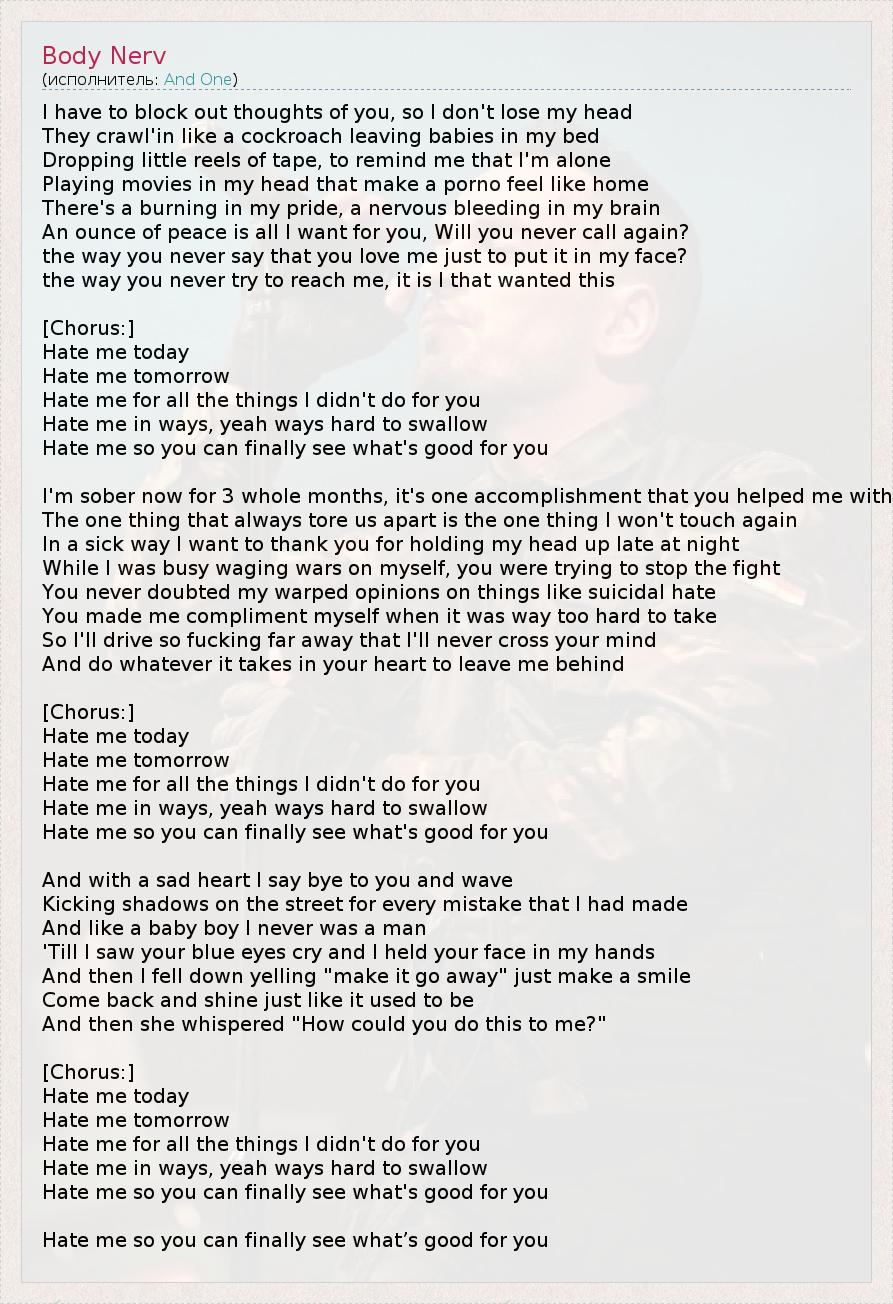Я должен блокировать мысли о тебе, тогда я не сойду с ума. Мысли лезут в мою голову как тараканы, оставляющие малышей в моей кровати, Роняя маленькие фрагменты пленки, чтобы напомнить мне, что я одинок. Сцены, которые крутятся у меня в голове, похожи на домашний порно фильм Моя гордость сгорает, в голове - нервное кровотечение. Все, что я хочу от тебя, это, чуточку согласия. Неужели ты никогда больше не позвонишь? И неужели ты никогда не скажешь, что любишь меня, глядя мне в глаза, И никогда не постараешься меня понять? Ведь именно я хотел этого.... [Припев:] Ненавидь меня сегодня, Ненавидь меня завтра, Ненавидь за то, чего я для тебя не сделал. Ненавидь так, чтобы для меня это было нестерпимо, Ненавидь меня, и ты, наконец-то, поймешь, что для тебя лучше... Я трезв уже целых три месяца, это - то единственное, в чем ты мне помогла, Это та единственная причина, из-за которой мы ссорились, и больше я не хочу возвращаться к этому. Хочу сказать спасибо за то, что ты была рядом со мной ночи напролет, когда мне было плохо, Пока я был занят, борясь с самим собой, ты пыталась прекратить это... Тебя никогда не волновал мой искажённый взгляд на такое явление, как суицидальная ненависть, Ты меня хвалила даже тогда, когда это было невозможно. Что ж, я уеду так далеко, чтобы ты больше никогда не вспоминала обо мне, И сделаю все, чтобы в твоём сердце остаться позади... [Припев:] Ненавидь меня сегодня, Ненавидь меня завтра, Ненавидь за то, чего я для тебя не сделал. Ненавидь так, чтобы для меня это было нестерпимо, Ненавидь меня, и ты, наконец-то, поймешь, что для тебя лучше... И с печальным сердцем я попрощаюсь с тобой, Ударяя тени на улицах за каждую ошибку, которую совершил... Как маленький мальчик, я не был взрослым, Пока не увидел твои голубые глаза в слезах и не дотронулся до твоего лица... Затем я упал, вопя: «Сделай так, чтобы все это прошло!» Чтобы вернуть твою прежнююю улыбку и сияние, А она прошептала: «Как ты мог сделать это со мной?» [Припев:] Ненавидь меня сегодня, Ненавидь меня завтра, Ненавидь за то, чего я для тебя не сделал. Ненавидь так, чтобы для меня это было нестерпимо, Ненавидь меня, и ты, наконец-то, поймешь, что для тебя лучше... Ненавидь меня, и ты, наконец-то, поймешь, что для тебя лучше...