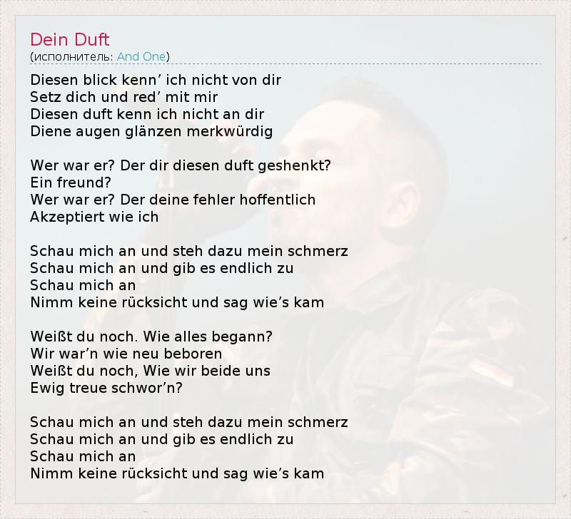 Diesen Blick KENN ' Ich Nicht фон реж СЭТЗ Dich унд красный ' мит Мир Diesen Duft кенн ич Nicht в реж Диеновый Augen glänzen merkwürdig Wer война э ? Der реж Diesen Duft geshenkt ? Эйн Фройнд ? Wer война э ? Der Fehler Deine hoffentlich Akzeptiert Wie Ich Schau Мичиган в унд steh Dazu Mein Schmerz Schau Мичиган в унд колодка ES Endlich цу Schau Мичиган Кам Nimm Keine rücksicht унд SAG Wie в Weißt дю Ночь . Ви Alles begann ? Wir war'n Wie Neu beboren Weißt дю Ночь , Wie Wir Beide UNS Ewig Treue schwor'n ? Schau Мичиган в унд steh Dazu Mein Schmerz Schau Мичиган в унд колодка ES Endlich цу Schau Мичиган Кам Nimm Keine rücksicht унд SAG Wie в