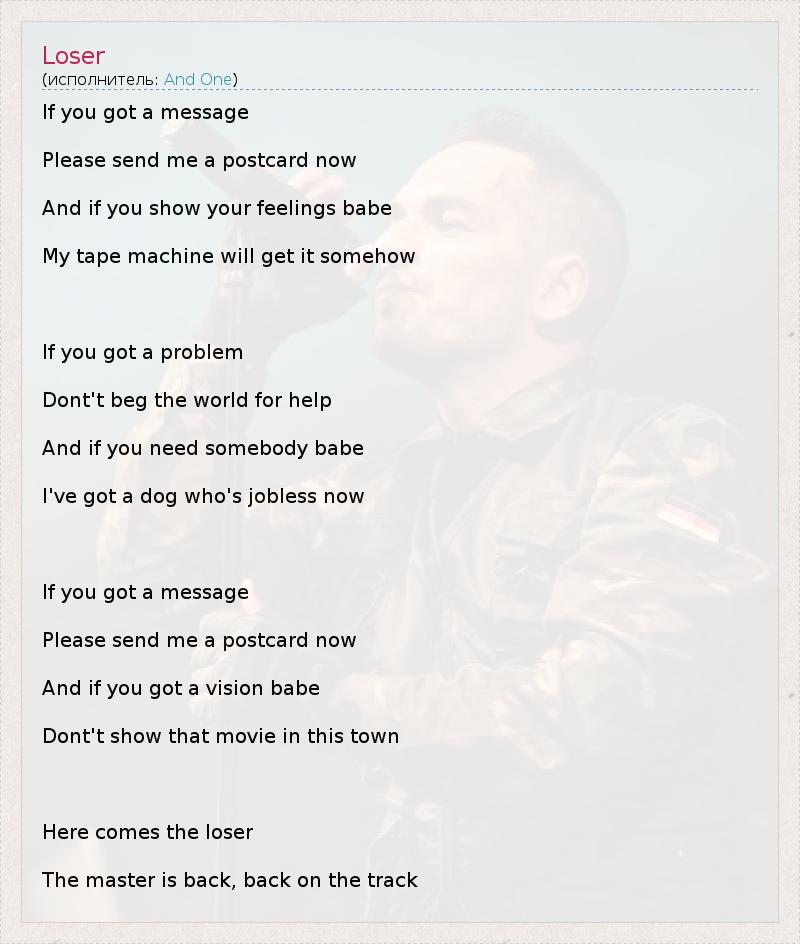 If you got a message Please send me a postcard now And if you show your feelings babe My tape machine will get it somehow If you got a problem Dont't beg the world for help And if you need somebody babe I've got a dog who's jobless now If you got a message Please send me a postcard now And if you got a vision babe Dont't show that movie in this town Here comes the loser The master is back, back on the track