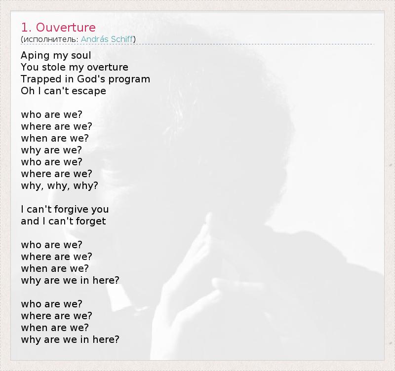 Экзогенезис: Симфония. Часть 1 (Увертюра) Передразнивая мою душу, Ты украла мою увертюру, В ловушке программы Бога, О, я не могу сбежать. Кто мы? Где мы? Когда мы? Почему мы? Кто мы? Где мы? Почему, почему, почему? Я не могу простить тебя, И я не могу забыть. Кто мы? Где мы? Когда мы? Почему мы здесь? Кто мы? Где мы? Когда мы? Почему мы здесь?