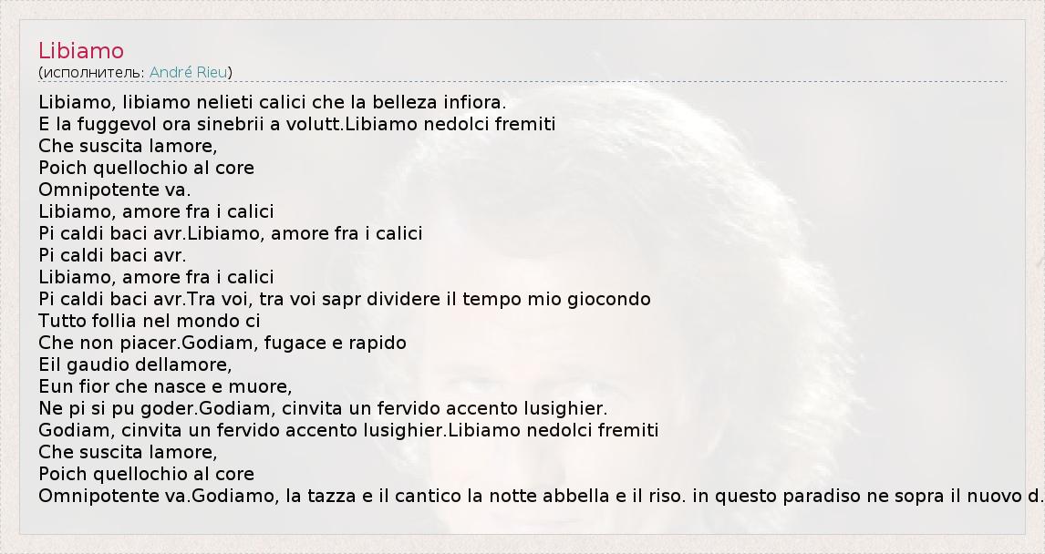 Libiamo, libiamo nelieti calici che la belleza infiora. E la fuggevol ora sinebrii a volutt.Libiamo nedolci fremiti Che suscita lamore, Poich quellochio al core Omnipotente va. Libiamo, amore fra i calici Pi caldi baci avr.Libiamo, amore fra i calici Pi caldi baci avr. Libiamo, amore fra i calici Pi caldi baci avr.Tra voi, tra voi sapr dividere il tempo mio giocondo Tutto follia nel mondo ci Che non piacer.Godiam, fugace e rapido Eil gaudio dellamore, Eun fior che nasce e muore, Ne pi si pu goder.Godiam, cinvita un fervido accento lusighier. Godiam, cinvita un fervido accento lusighier.Libiamo nedolci fremiti Che suscita lamore, Poich quellochio al core Omnipotente va.Godiamo, la tazza e il cantico la notte abbella e il riso. in questo paradiso ne sopra il nuovo d.