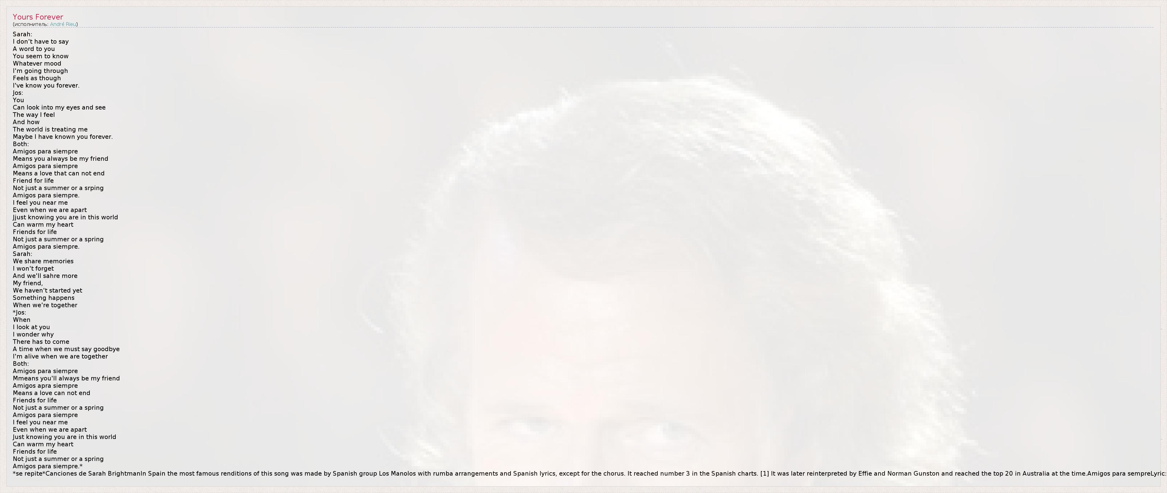*se repite*Canciones de Sarah BrightmanIn Spain the most famous renditions of this song was made by Spanish group Los Manolos with rumba arrangements and Spanish lyrics, except for the chorus. It reached number 3 in the Spanish charts. [1] It was later reinterpreted by Effie and Norman Gunston and reached the top 20 in Australia at the time.Amigos para sempreLyric: