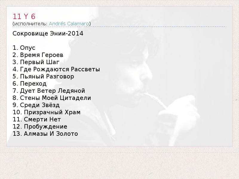 Это интересно:Культовый музыкант Andrés Calamaro (Andrés Calamaro Masel) Андрес Каламаро - и сегодня главная икона аргентинского рока. Родился 22 августа 1961 года в Буэнос-Айресе.Аргентинский музыкант и композитор. Одна из групп, в которые он входил, - Los Rodríguez - была одной из самых успешных и популярных в Испании в 1990-ые годы.В 17 лет Андрес участвовал в качестве приглашенного музыканта на альбоме... продолжение