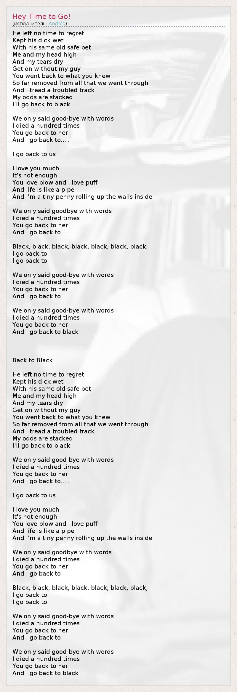 He left no time to regret Kept his dick wet With his same old safe bet Me and my head high And my tears dry Get on without my guy You went back to what you knew So far removed from all that we went through And I tread a troubled track My odds are stacked I'll go back to black We only said good-bye with words I died a hundred times You go back to her And I go back to..... I go back to us I love you much It's not enough You love blow and I love puff And life is like a pipe And I'm a tiny penny rolling up the walls inside We only said goodbye with words I died a hundred times You go back to her And I go back to Black, black, black, black, black, black, black, I go back to I go back to We only said good-bye with words I died a hundred times You go back to her And I go back to We only said good-bye with words I died a hundred times You go back to her And I go back to black Back to Black He left no time to regret Kept his dick wet With his same old safe bet Me and my head high And my tears dry Get on without my guy You went back to what you knew So far removed from all that we went through And I tread a troubled track My odds are stacked I'll go back to black We only said good-bye with words I died a hundred times You go back to her And I go back to..... I go back to us I love you much It's not enough You love blow and I love puff And life is like a pipe And I'm a tiny penny rolling up the walls inside We only said goodbye with words I died a hundred times You go back to her And I go back to Black, black, black, black, black, black, black, I go back to I go back to We only said good-bye with words I died a hundred times You go back to her And I go back to We only said good-bye with words I died a hundred times You go back to her And I go back to black