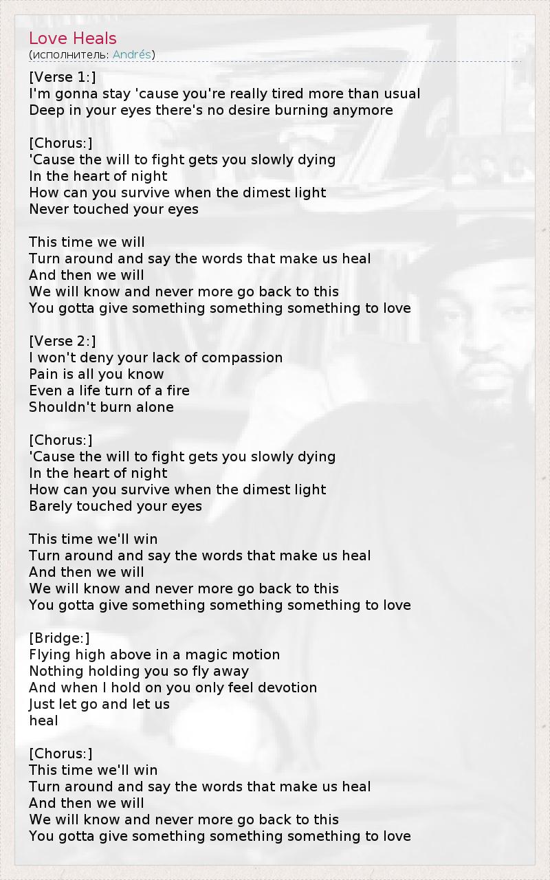 [Verse 1:] I'm gonna stay 'cause you're really tired more than usual Deep in your eyes there's no desire burning anymore [Chorus:] 'Cause the will to fight gets you slowly dying In the heart of night How can you survive when the dimest light Never touched your eyes This time we will Turn around and say the words that make us heal And then we will We will know and never more go back to this You gotta give something something something to love [Verse 2:] I won't deny your lack of compassion Pain is all you know Even a life turn of a fire Shouldn't burn alone [Chorus:] 'Cause the will to fight gets you slowly dying In the heart of night How can you survive when the dimest light Barely touched your eyes This time we'll win Turn around and say the words that make us heal And then we will We will know and never more go back to this You gotta give something something something to love [Bridge:] Flying high above in a magic motion Nothing holding you so fly away And when I hold on you only feel devotion Just let go and let us heal [Chorus:] This time we'll win Turn around and say the words that make us heal And then we will We will know and never more go back to this You gotta give something something something to love